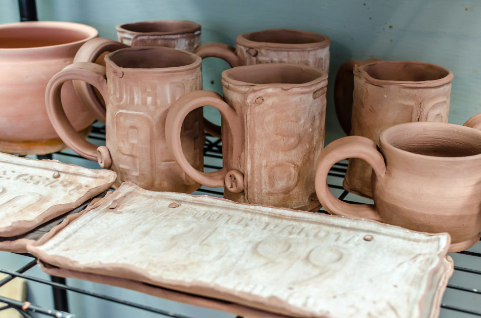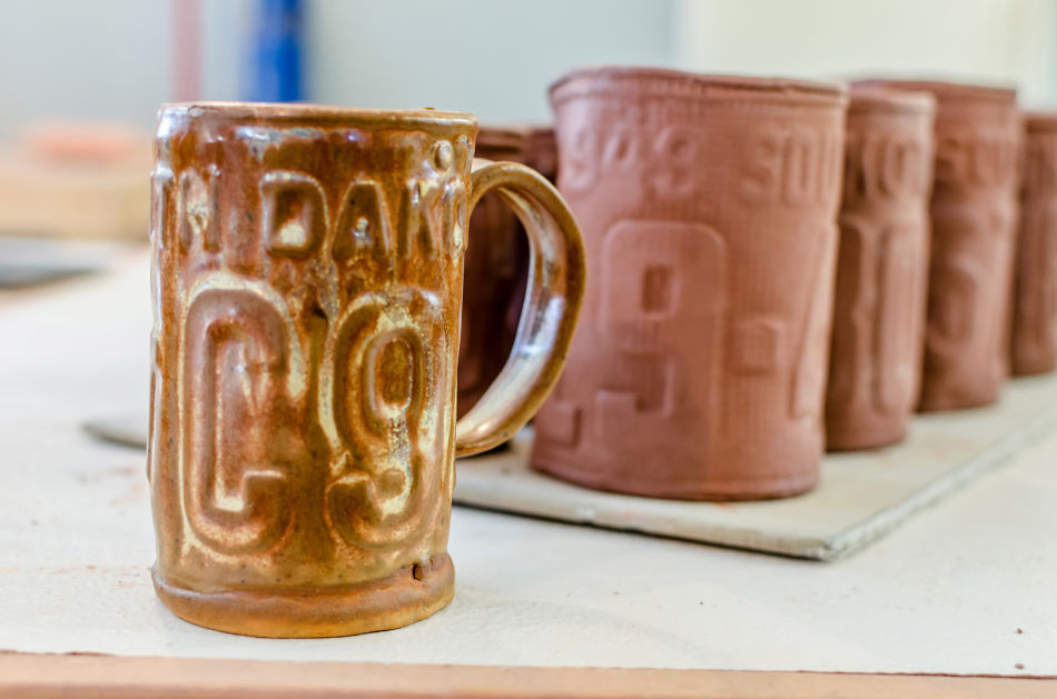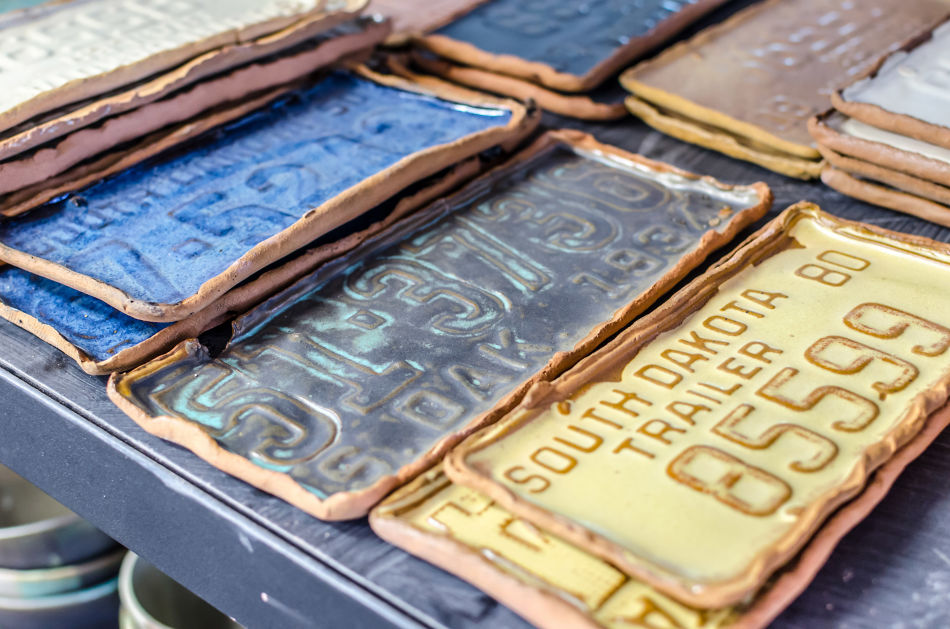 Someday, she aspires to have Kat Ceramics be her one and only day job; for now, she does work for local businesses and also takes special orders. Shreuers has been shaping and forming since she was in high school, but she explains that it was in college that she really got into it and learned the most. She does enjoy other forms of art, but pottery allows her to get hands-on and build something 3D. Her most popular items are her license plates trays and mugs. She explains that many artists use license plates in their work, but each artist forms something unique and different. The idea for license plate mugs actually came when a friend said that she had seen a mug in Montana, and she asked Katie if she could make something using South Dakota plates. She usually makes smaller pottery like mugs, trays, and dishware, but hopes that soon she will be able to create bigger pieces.