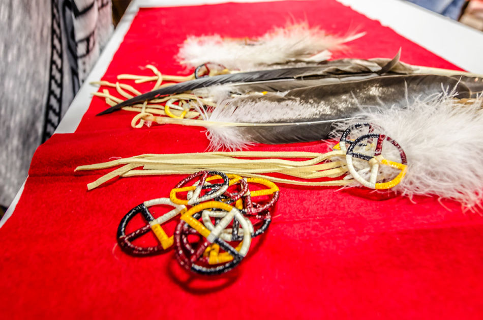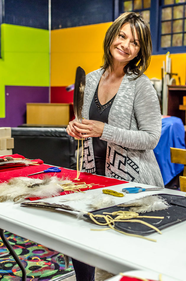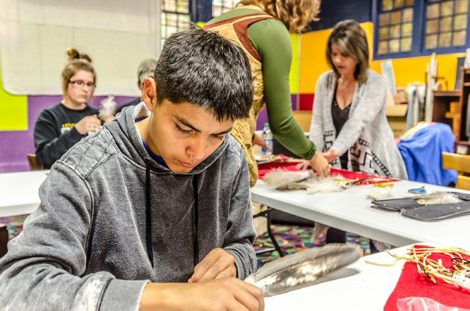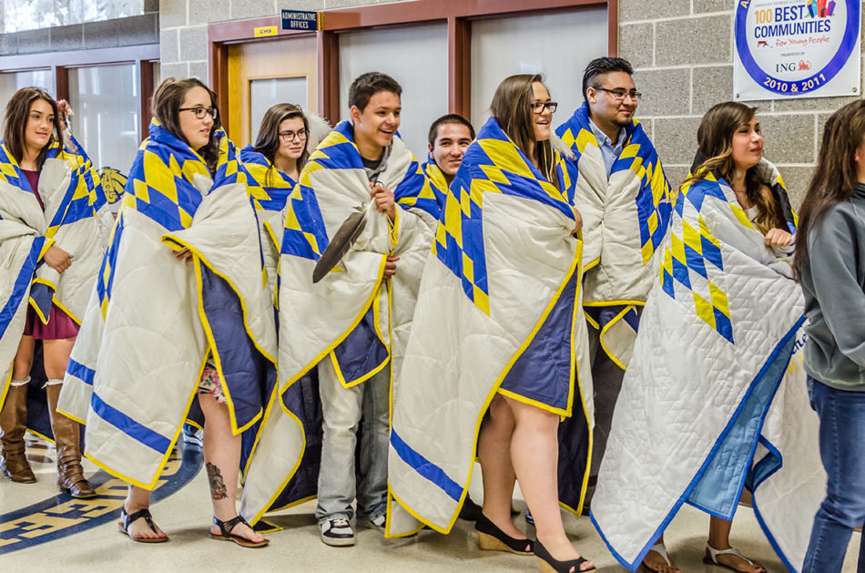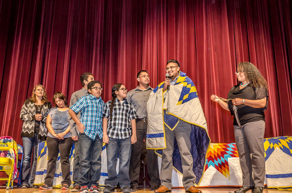 Members of the American Indian Parent Advisory Council and parents met prior to the honoring ceremony to assemble the feathers and medicine wheels. Feathers came from the United States Fish and Wildlife Service’s National Eagle Repository. Preparation included purification with the smoke of burning sage of those handling the feathers, the feathers themselves, and the porcupine quill decorated medicine wheels created for the feathers. This purification process is called azilya (ah zeal ya). // – By Dani Daugherty