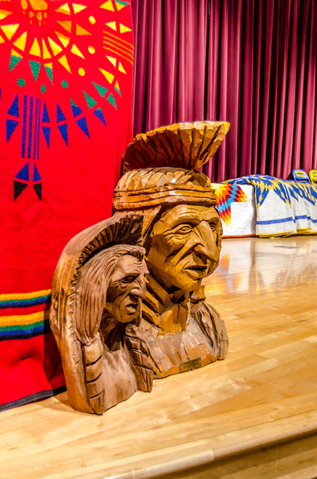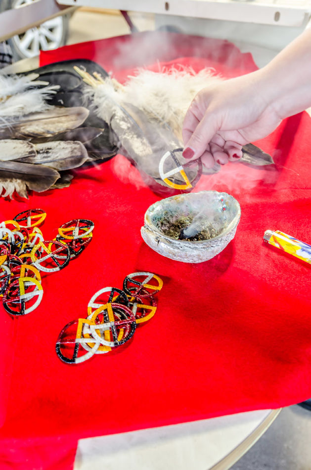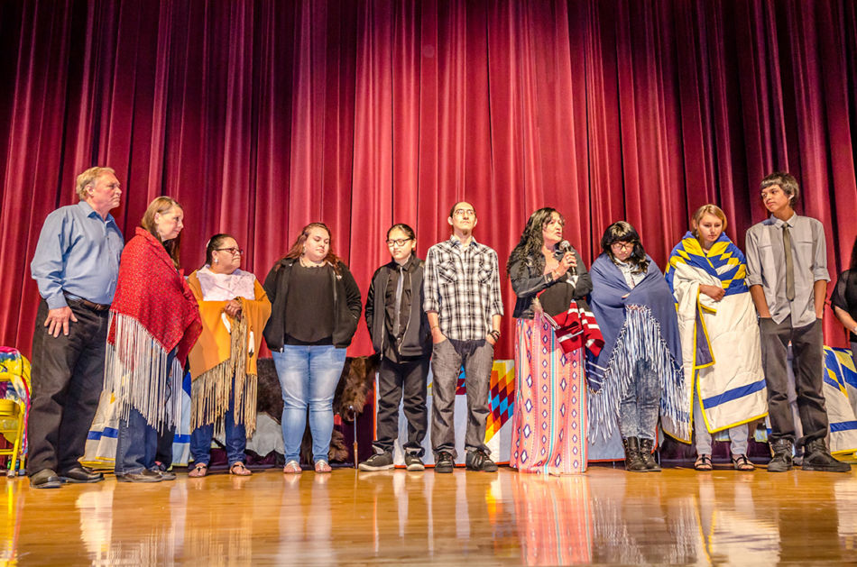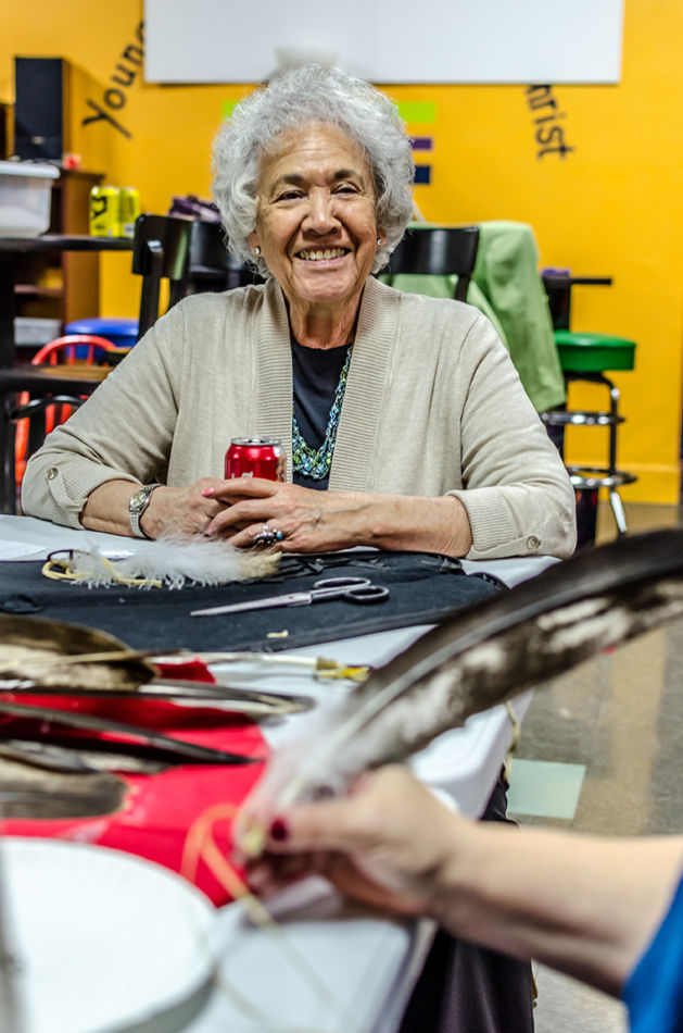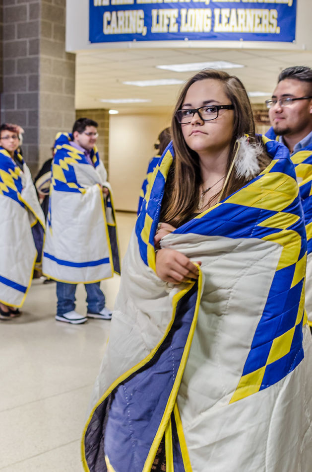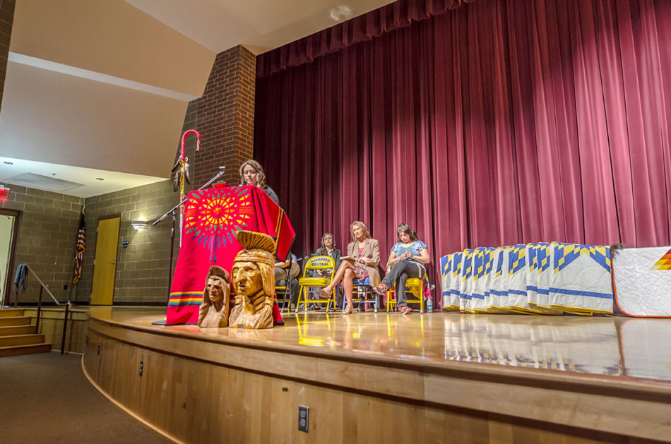 Members of the American Indian Parent Advisory Council and parents met prior to the honoring ceremony to assemble the feathers and medicine wheels. Feathers came from the United States Fish and Wildlife Service’s National Eagle Repository. Preparation included purification with the smoke of burning sage of those handling the feathers, the feathers themselves, and the porcupine quill decorated medicine wheels created for the feathers. This purification process is called azilya (ah zeal ya). // – By Dani Daugherty