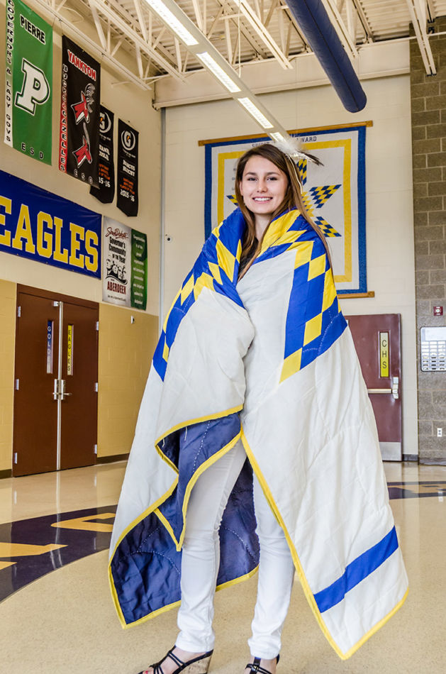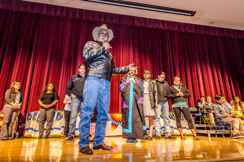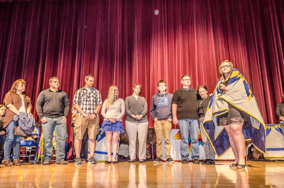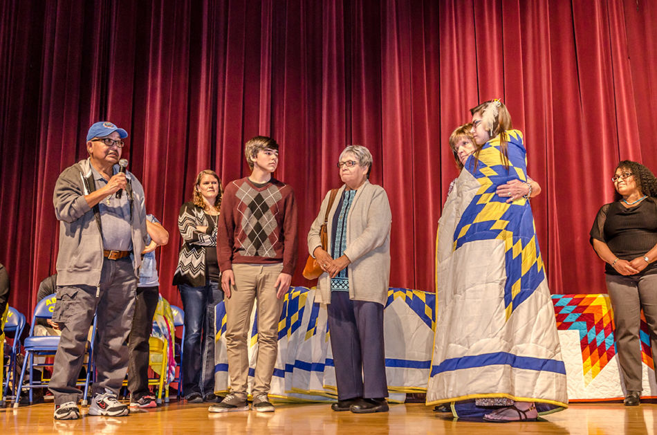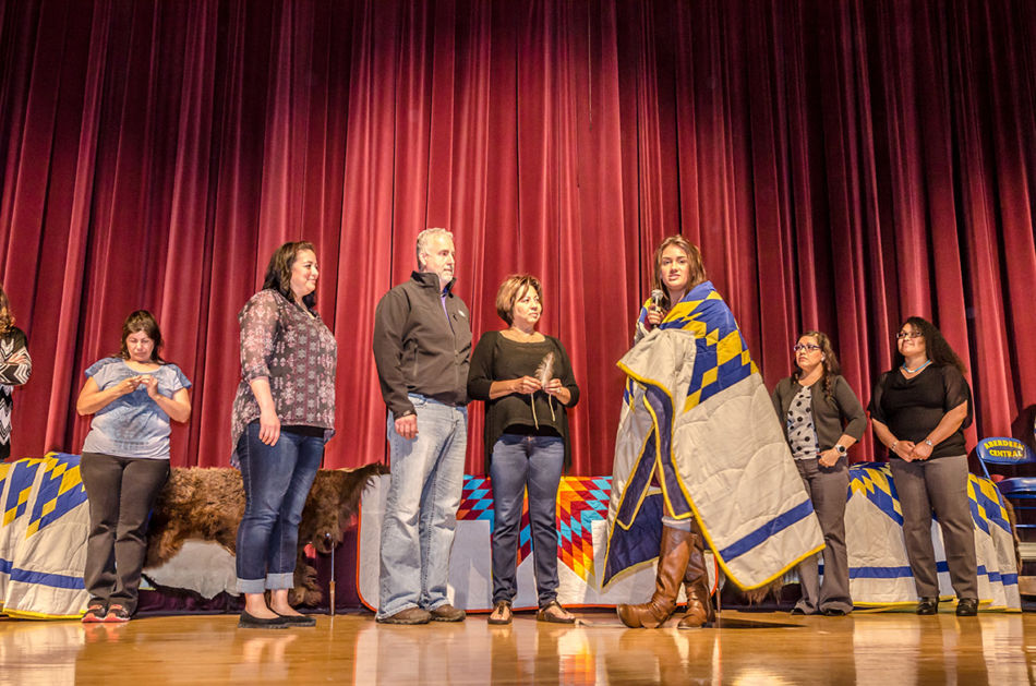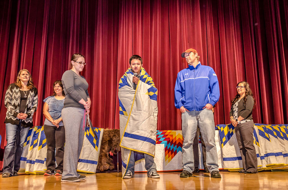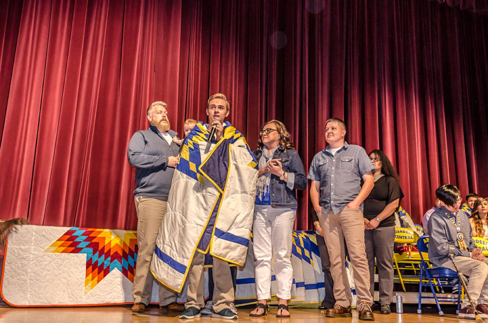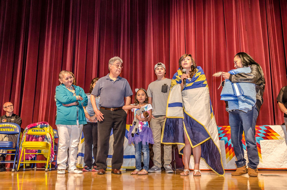 In a beautifully personal celebration, each graduate received a star quilt from the Aberdeen Public Schools’ Office of Indian Education. Graduates also spoke about their future plans and introduced each family member who came to support them. Some graduates received personal gifts or guidance from their family, including words of encouragement, a personalized quilt one graduate received from her grandmother, and a traditional song. The honoring included special recognition of the efforts of Doug Neuharth, Coordinator of the Office of Indian Education. It was noted that during Mr. Neuharth’s tenure, Aberdeen demonstrated some of the highest Native American student test scores statewide and was successful in prestigious Native American college scholarship applications. Mr. Neuharth demurred that the students made him look good.