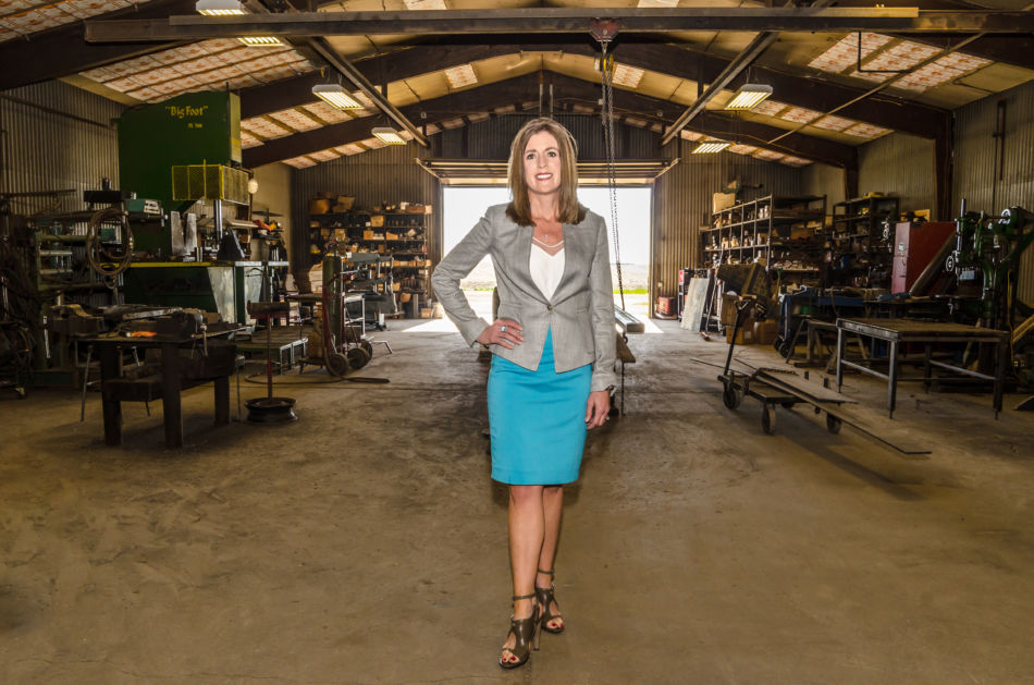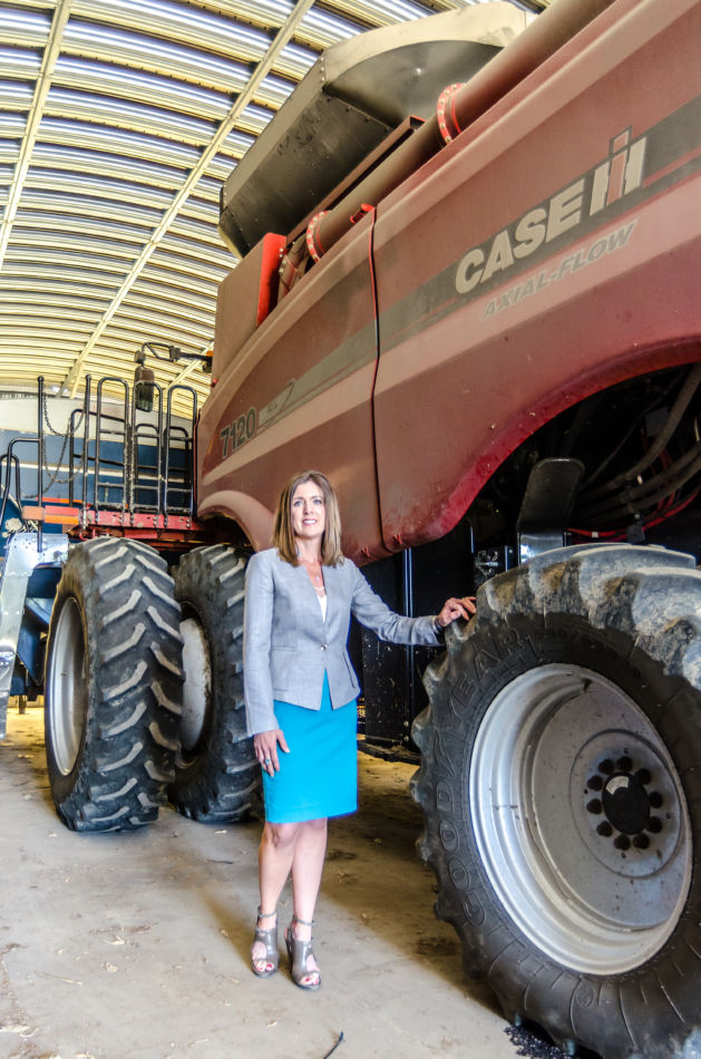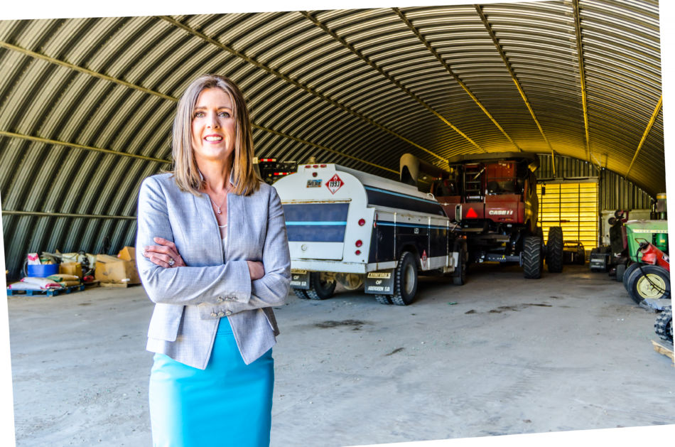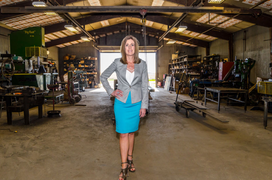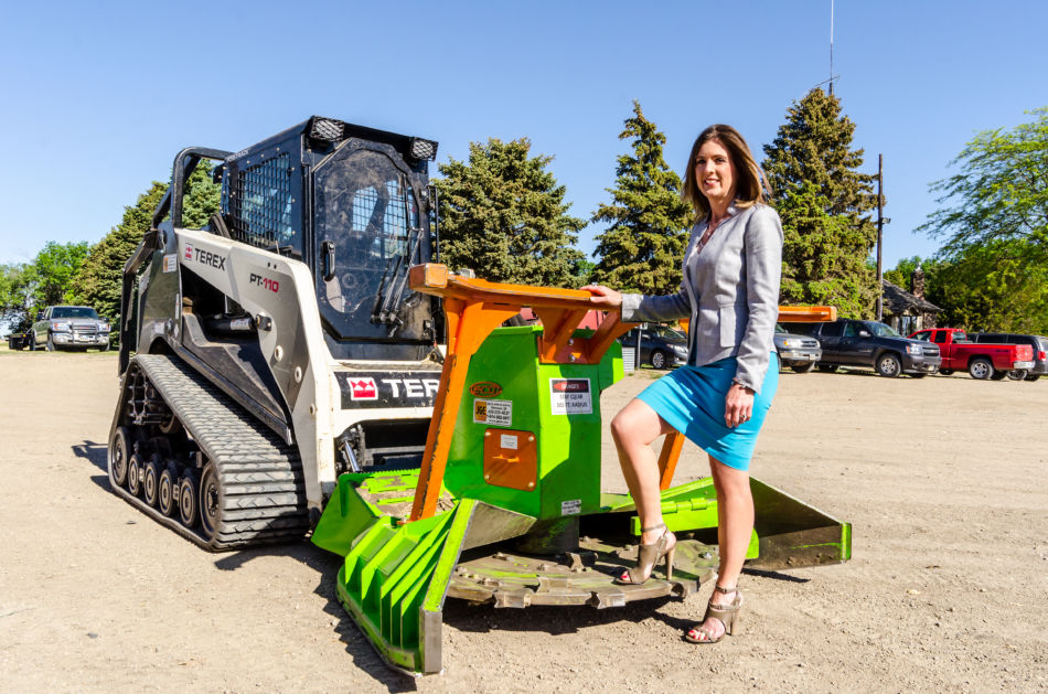 Heidi poses next to a skid steer that is used in her family’s company, Brown County Choppers, LLC.