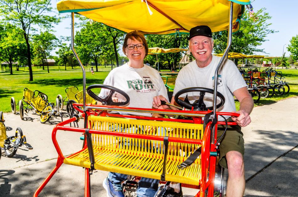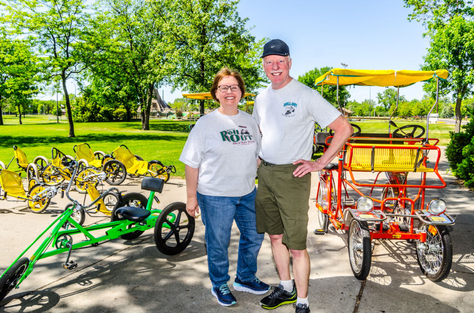 John and Sandy Wien Kersten pose amongst the wide selection of bikes they offer at Roll Out Bicycle and Skate Rental.