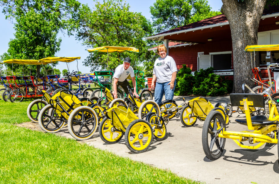 During their second year at Wylie, a customer asked John if he had any three-wheeled banana bikes for rent. “I had never heard of them,” he says. The customer told him more about these bikes, called fun cycles, which she had used at a KOA camp in the Black Hills. Kersten called the KOA and found out more information about the bikes and decided to purchase some of his own to rent out. People immediately loved using them and he has kept gathering more varieties of unusual bikes for his customers ever since.