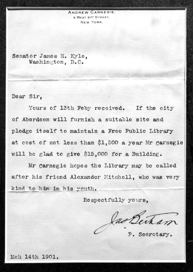 These libraries came to be known as Carnegie Libraries. In all, South Dakota received 25 Carnegie Libraries, several of which still remain today. Aberdeen’s library was built in 1901 with a $15,000 grant on the corner of 6th Avenue and Lincoln Street at the current location of the First United Methodist Church’s expansion wing. It opened the following year and served the community until it was condemned in 1950. It was in fact, not named after Carnegie, but rather for his friend, fellow Scottish immigrant, and president of the Chicago, Milwaukee, and St. Paul Railroad, the late Alexander Mitchell. Carnegie thought it fitting to name the Aberdeen library for Mitchell because he was from Aberdeenshire, Scotland, the namesake of our city. The legend goes that Aberdeen has the only Carnegie library not named after Andrew Carnegie. Despite inquiries with the Carnegie Foundation, this appears impossible to prove.