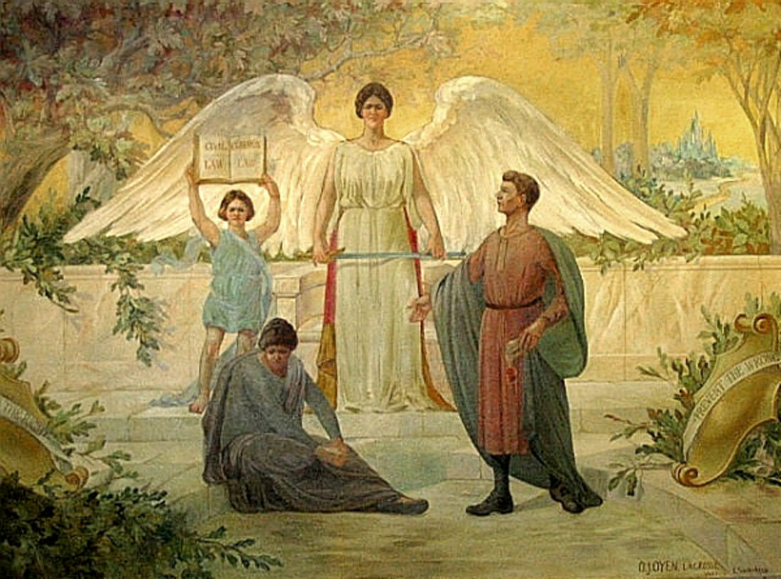 The scene in the courtroom that we still have today was repeated in other courthouses across the country. This was a favorite scene for Soderberg, as it features Susanna from the book of Daniel in the Old Testament. Susanna was accused by two men who spied on and lusted after her. When she refused sex with them, they told her they would say she was with a man in an attempt to shame her and have her put to death. This painting is of the trial she faced, and won. The large angel overseeing the trial is Justice. This painting is done on canvas and applied to the wall within a raised plaster boarder. Soderberg’s signature is clearly visible in the lower right, and a small ad for his firm is directly below the title in the nameplate.