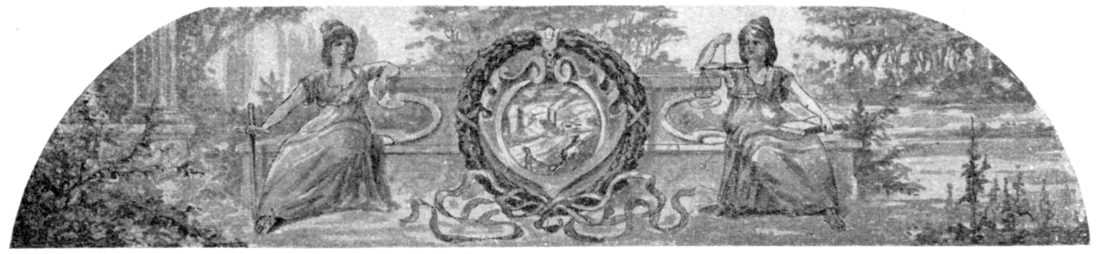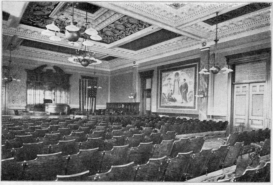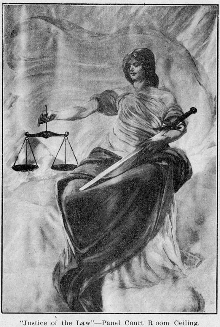 The 1904 dedication booklet gives a thorough account of the building’s details, including the types of marble, granite, terrazzo, paint, moldings, and of course, artwork. After all, a government building wouldn’t be complete without allegorical murals to help convey the concepts of justice and the American way. Unfortunately, most of this art is lost. When major remodeling took place in 1968 and 1974, an elevator was added smack dab in the center of the rotunda, with offices built around the shaft. In the remodeling of the courtroom and rotunda, we lost all the signs of the zodiac that were painted in the dome, two ceiling murals, and two wall friezes at the base of the rotunda tower. What does remain is a large mural in the third-floor courtroom (left).