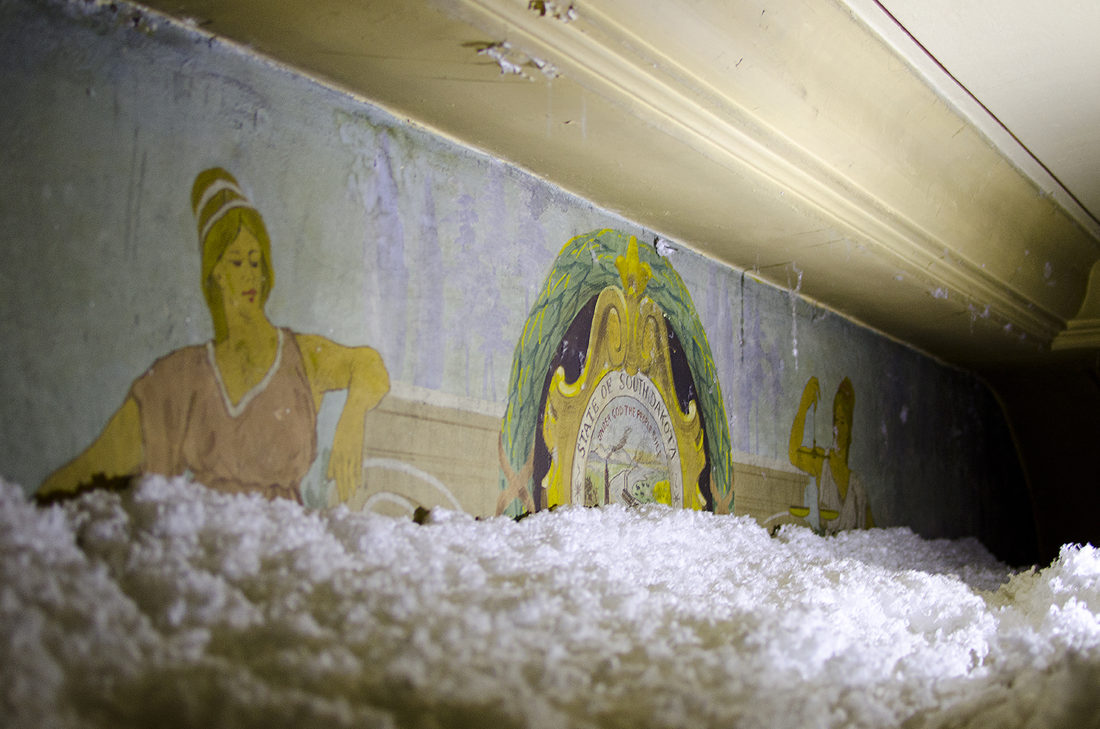 Two paintings, done directly on a wall below the rotunda dome, are completely covered up by a new ceiling, but can still be seen through an opening in a wall in the attic space of the courthouse. They’re not easy to get to, and one must maneuver over an exposed plaster ceiling underfoot, almost jumping to an I-beam worthy of supporting a viewer. Of course it’s completely dark in the newly created void, so the painting isn’t too faded. Unfortunately blown-in insulation conceals about half of it (top right). There is another painting on the opposite side of this space, but it is very faint and no records exist indicating what it looks like. The only thing visible on it is a row of faded tree trunks.