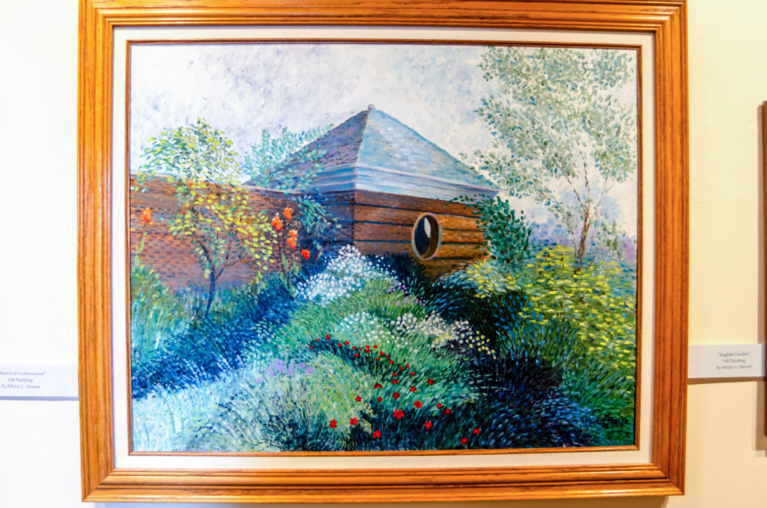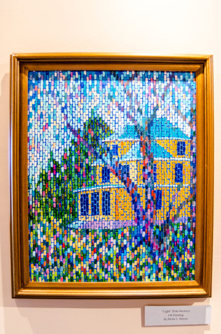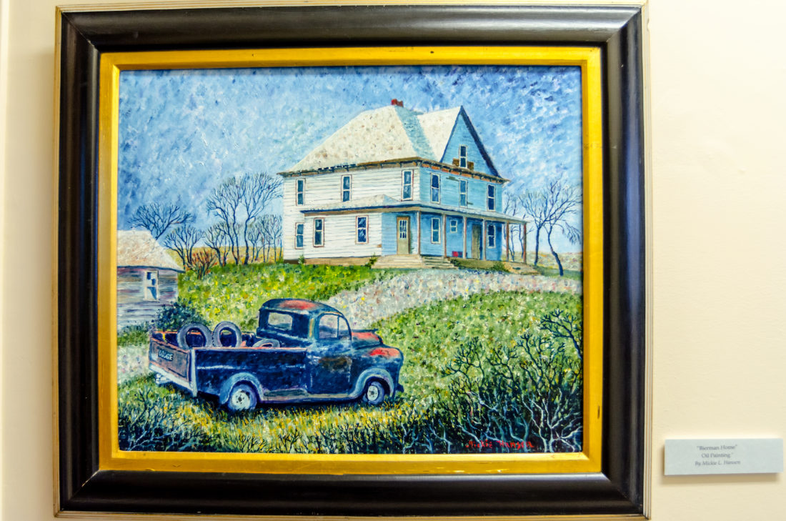 One of her favorite paintings in her mostly oil work collection is Bierman House. “It’s a depiction of the house, chicken house, and old pick-up located on the farm my grandfather homesteaded between Chelsea and Mansfield.” She adds that the farm is still owned by members of her family today.