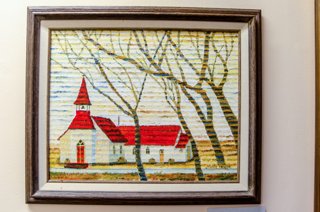 Many of her paintings show real scenes of old houses and churches surrounded by foliage that scatter the South Dakota countryside. While she has painted outdoors on site, she says she mostly has to take photographs of the places she is painting and finish the projects at home. “In this country the weather is never perfect,” she laughs. In addition to scenery, she also paints and draws real people.