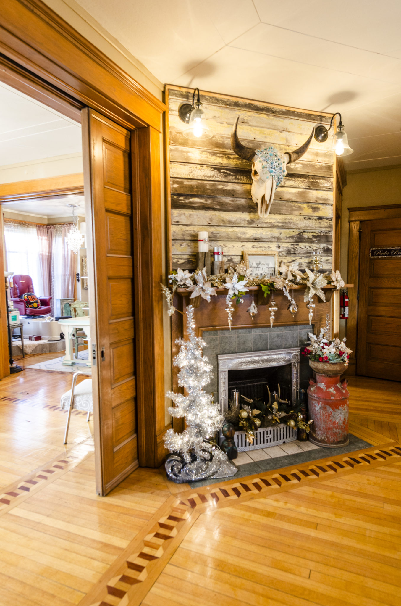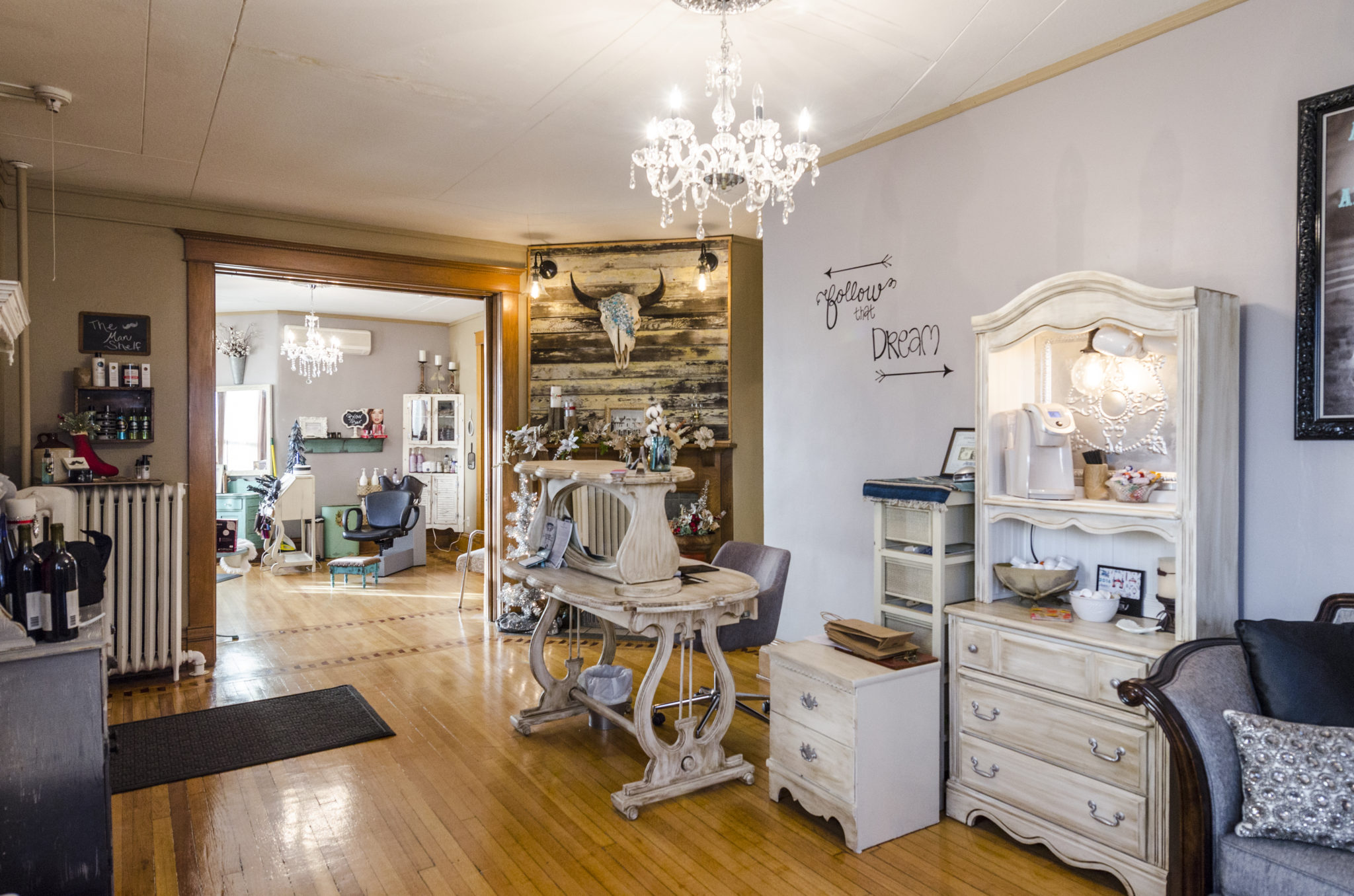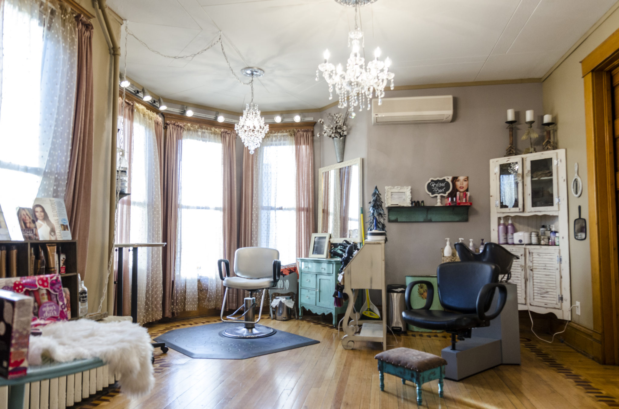 Melynda Sletten decided to fill one of these historic houses with life and activity when she chose it as the setting for her full service salon, Platinum Salon and Spa. Located in an old Victorian at 714 South Main Street, the salon has been open for two years and specializes in cuts, colors, easihair extensions, and Brazilian Blowouts. Melynda’s elegant and rustic style compliments the vintage features of the house perfectly, resulting in a comfortable retreat for her clients to relax in. “The character of the building is definitely something I wanted to have because it gives the salon a really home-like feeling,” she explains. Warm lighting, a farmhouse color scheme, and the refurbished furniture she selected for her décor all make for a welcoming atmosphere. In the center of everything stands an original fireplace with a mantel made out of weathered siding from her grandmother’s house. To add even more of a personal touch, black and white photographs of her grandparents on their wedding day also hang on the walls throughout the space.