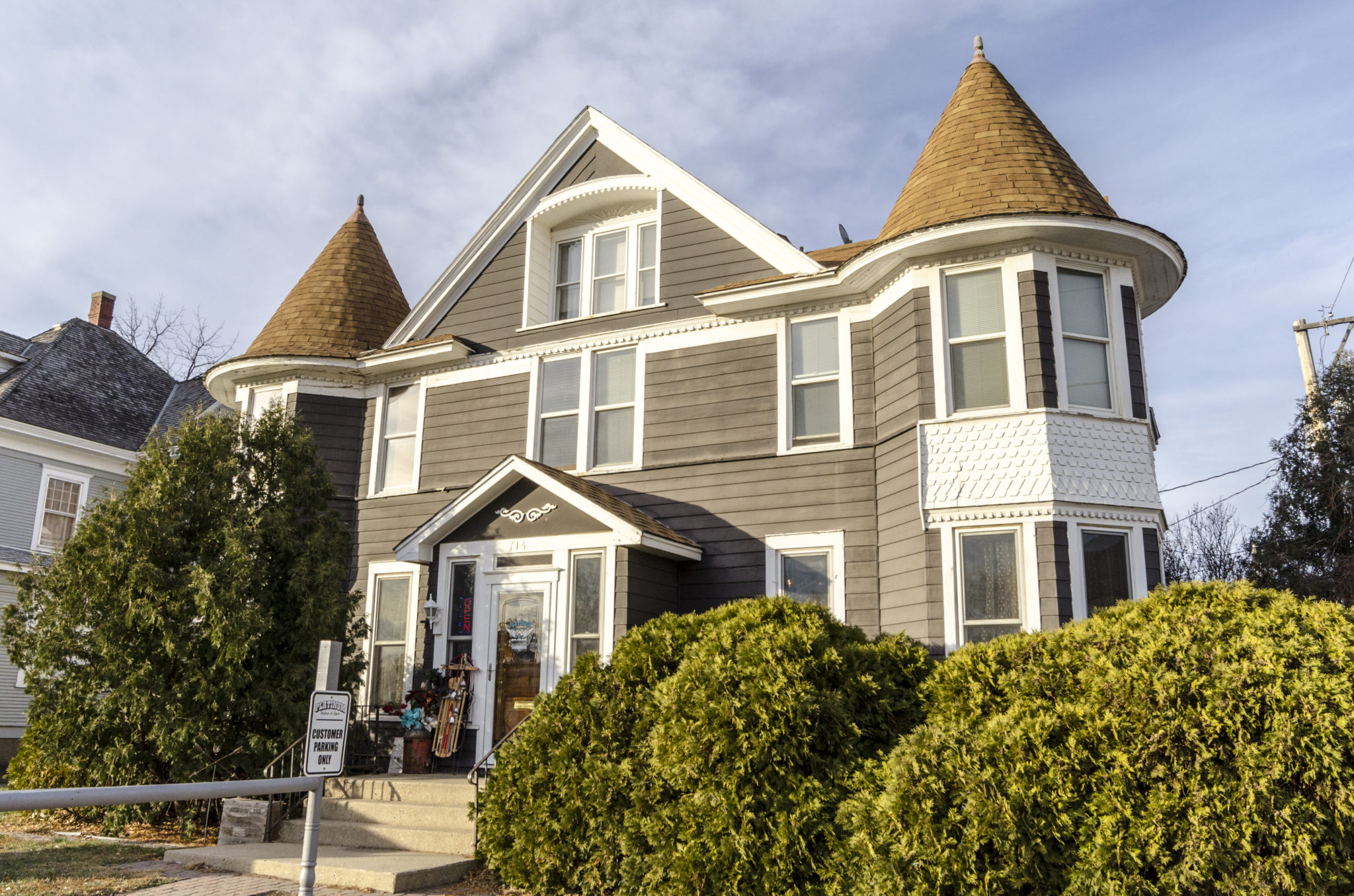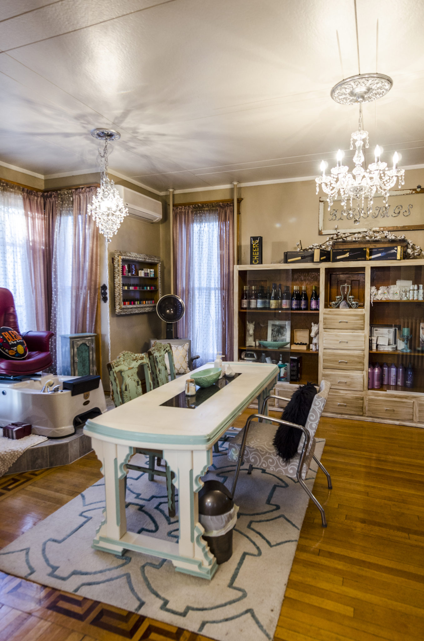 Melynda’s salon is on the home’s first floor along with another small business, Tara-dipity Massage, while apartments make up the rest of the square footage. The apartments were a renovation that started in the 1960s by Joe Geier, one of the home’s previous owners. Joe ran a barbershop from the same space Melynda is using for her salon and spa. His wife Gloria also operated a doll repair shop in the building at the same time. According to an interview with his daughter, Kris Rehfeld, in the Aberdeen American News, when Joe purchased the home it was fairly rundown and he spent many evenings repairing it over a 30 year time period.