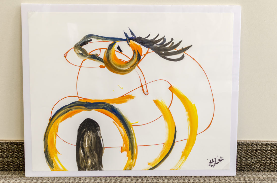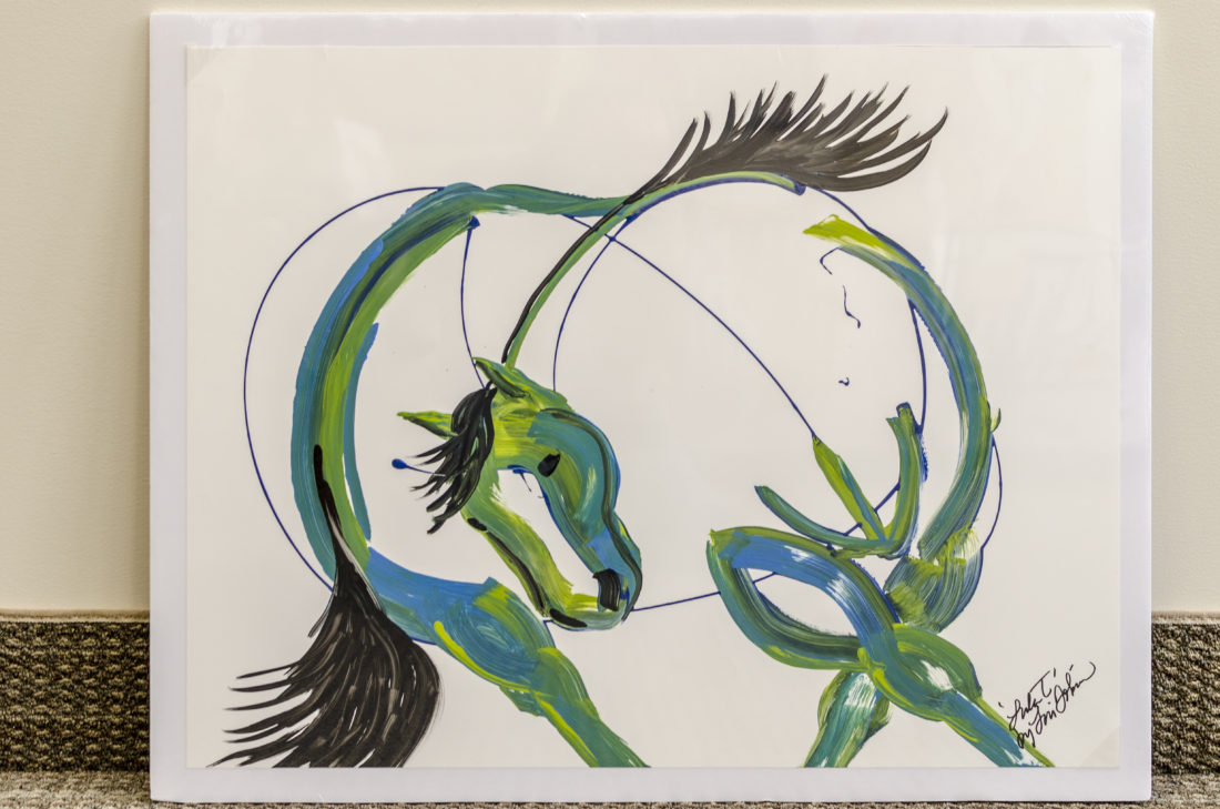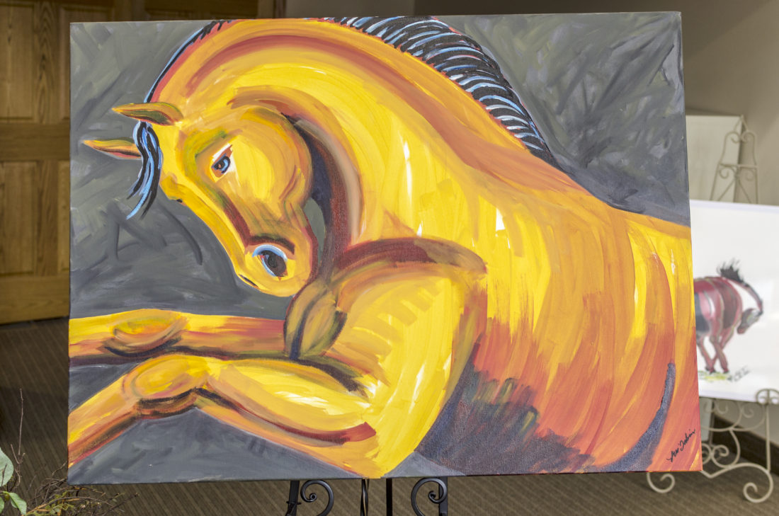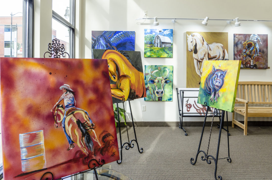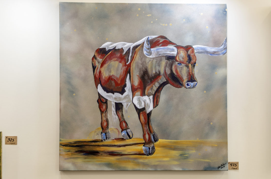 Looking at Lori’s paintings, it’s clear to see she has a love for nature and animals. Her nostalgic portraits of those common faces you see around a ranch, like a farm dog with his head resting on his paws, or a cow with her calf, can make the viewer feel like they’re looking at a picture of an animal they know or have seen before. But it’s her paintings of horses that truly make Lori’s work stand out, and that have also helped to expand her art business outside of Aberdeen. An avid equestrian herself, she paints horses in all scenes, from galloping around a barrel and kicking up dust in a rodeo event, to standing patiently in a quiet field. A couple years ago, she and her teenage daughter began traveling around the Midwest showing their horse at various quarter horse and breed shows, and Lori started taking her paintings with her and displaying them at these shows as well. She says, “It’s been fun because we’ve gotten to meet a lot of people. Sometimes people at the horse shows will see my paintings and it’s not something I’ve commissioned for them, but they’re drawn to it for some reason, or will say ‘Oh, that reminds me of a horse I had!’ So that’s why I like painting animals, nature, and South Dakota scenes, because those things mean something to others, and I can relate because they mean something to me too.”