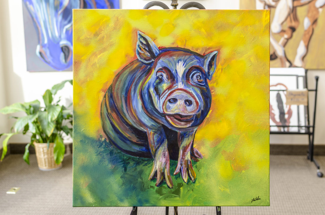 Lori describes herself as a “colorist” and likes to put all kinds of bright and bold colors into her paintings. “I very rarely use black or brown, even in my animal paintings,” she says. To keep her work diverse and to meet customer requests, she has also begun dabbling into human portraits and making seasonal décor paintings. “I got into doing holiday décor work kind of by accident. We were having a Christmas party at our house one year, and I decided I needed some winter scenes hanging around the house, so I made some!” No matter what she is painting or for whom, Lori is focused on creating work that others can cherish, and putting that personal connection to the people she is painting for and the things she holds close into her art. “Being an artist can be challenging as you get started, but it’s worth it to get to make things people love.” //–Jenny Roth