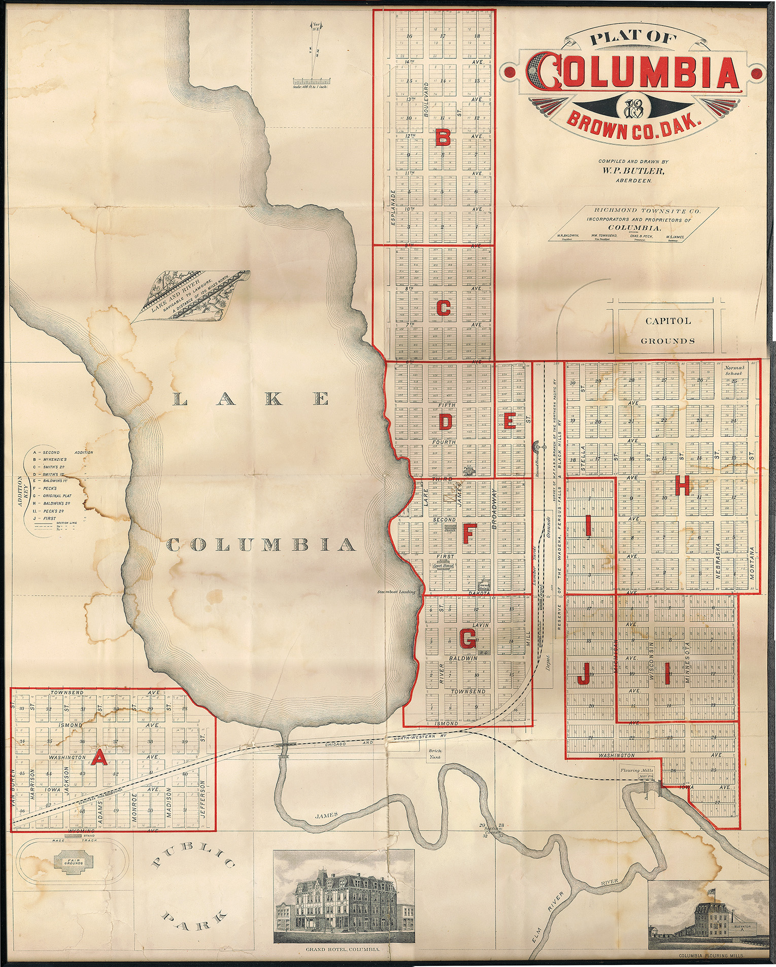 A vision that never happened This 1883 map of Columbia was probably a combination of what was already on the ground and what was planned for the future. Economic and physical disasters pretty much thwarted this vision, ending Columbia’s plan to be a capital city. As you may know, there is no lake there now, but there was. Many stories exist of the riverboats mooring there on their journey up and down the James River. It’s interesting to note that this map was drawn by an interesting fellow named W.P. Butler. He was one of the first mapmakers to draw all the railroad lines emanating from Aberdeen, and thusly defining it as the Hub City. He came to Aberdeen in 1881, as things were just getting started. There is a complete story about him in Don Artz’s book, A Souvenir of Aberdeen The Railroad Hub of the Dakotas. The late Mr. Artz writes in his dedication to Butler, “…Walter Percy Butler deserves to be remembered as the man who put the Hub City on the map.”