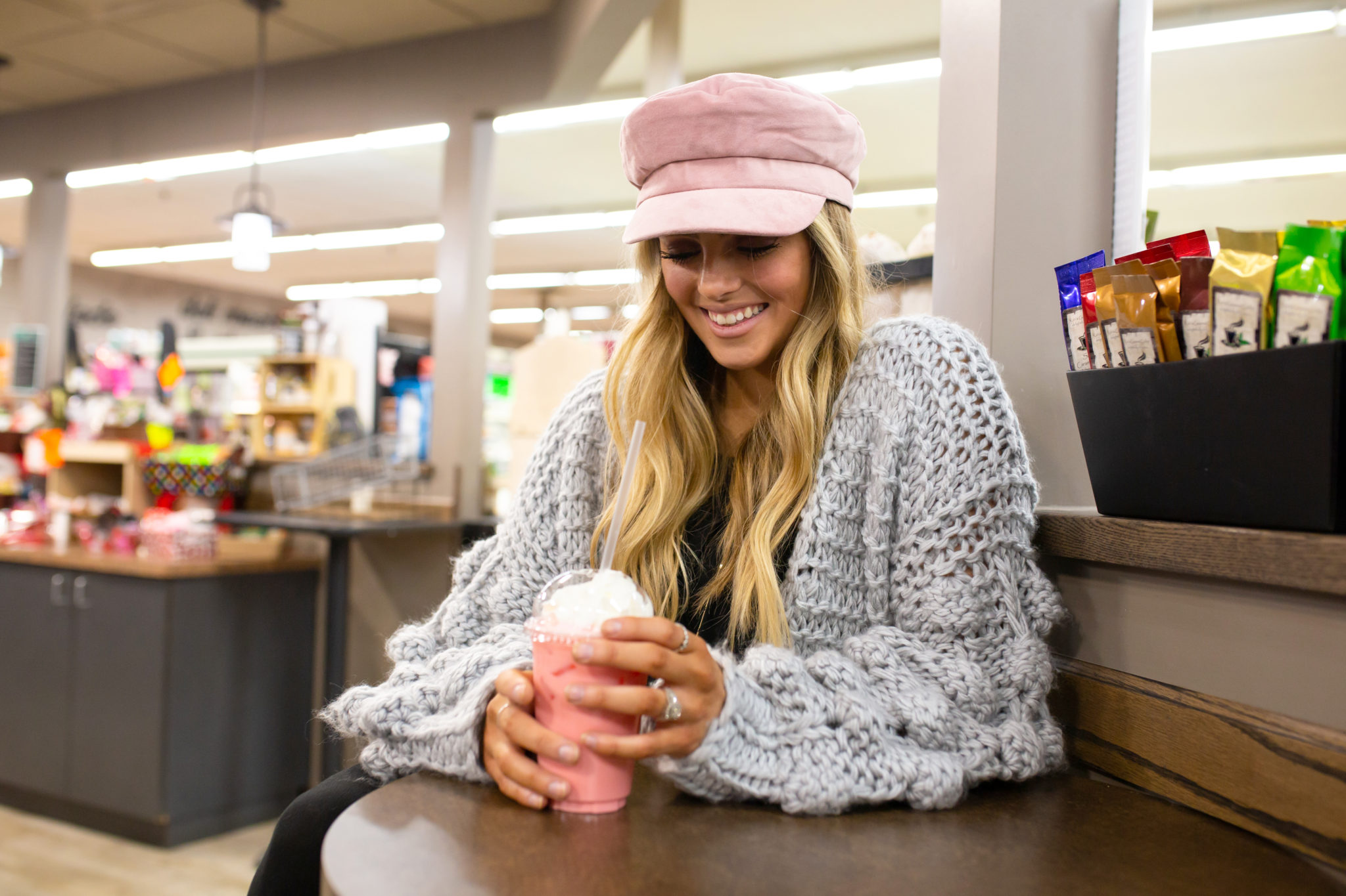 This cozy cardigan and hat combo is a must. Pair it with a solid or neutral colored shirt and statement necklace.