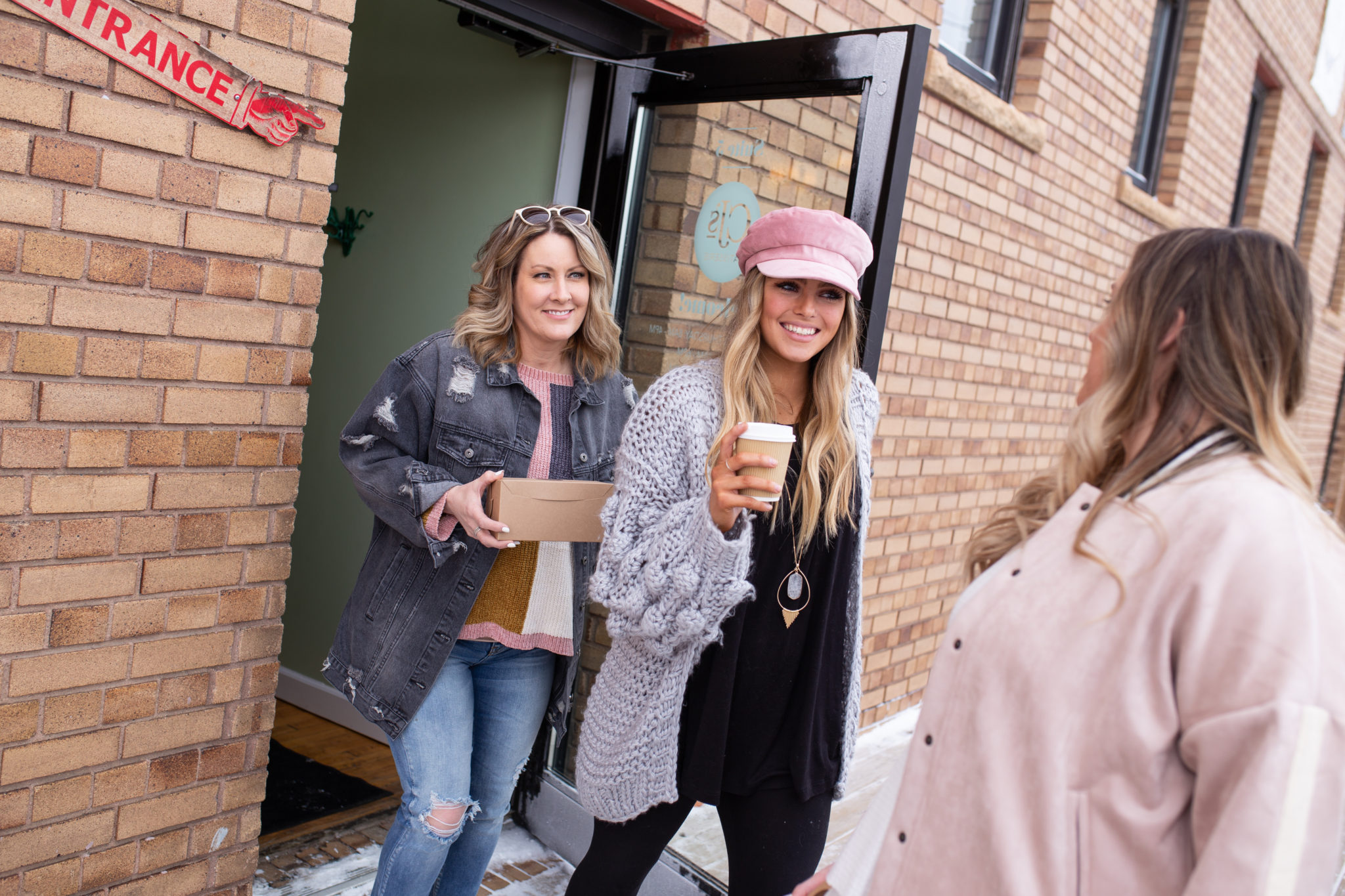 Nikki models a jacket option in light pink, while Tayler stays warm in a light gray sweater.