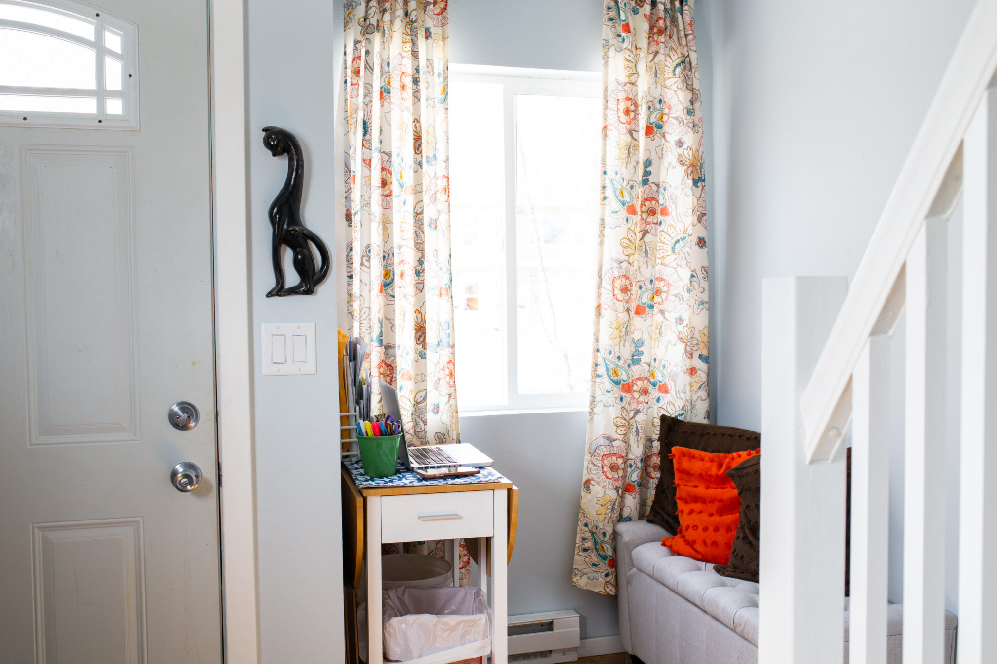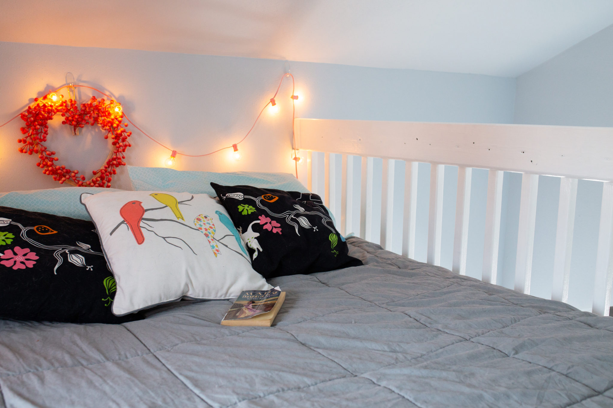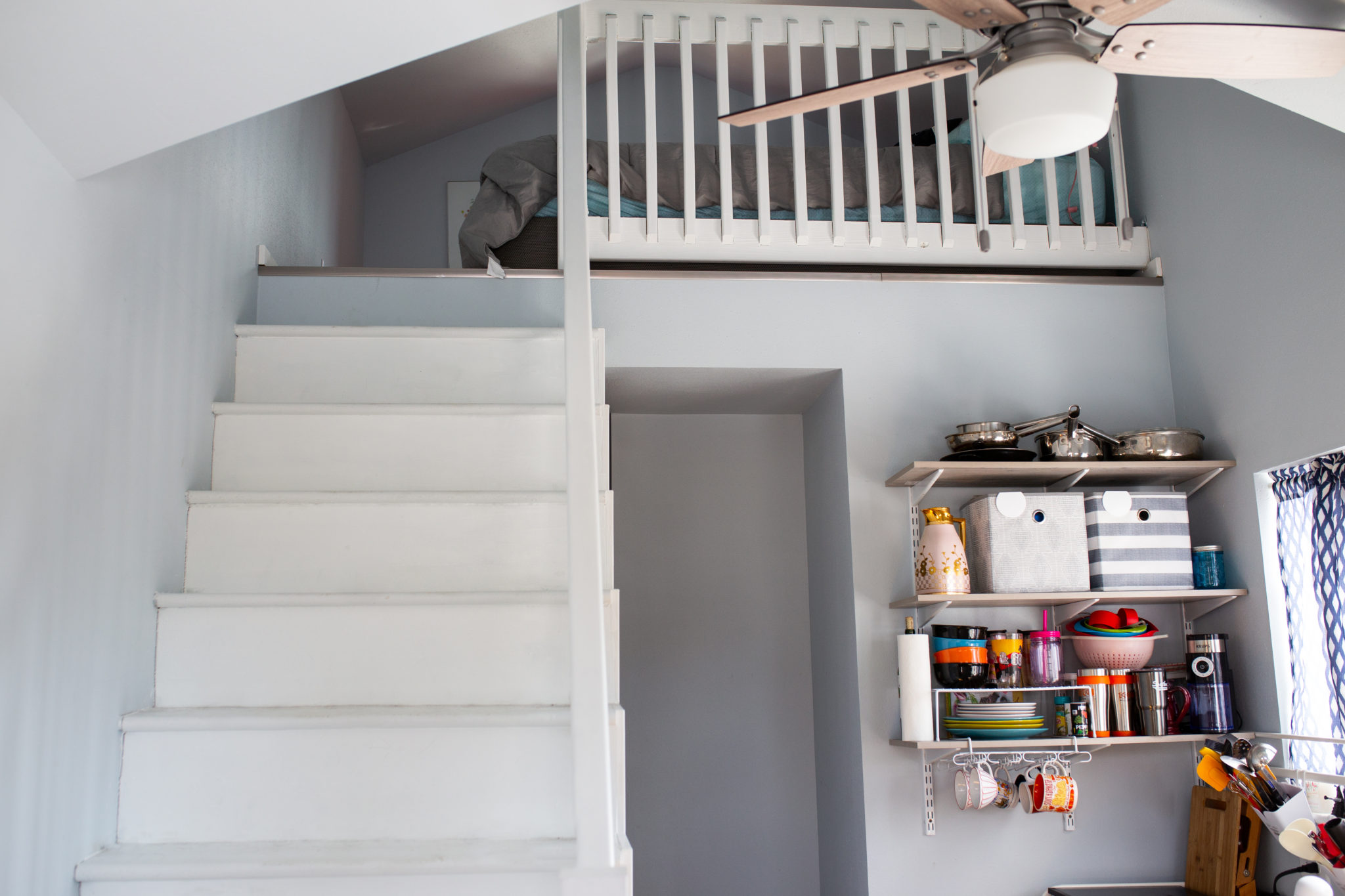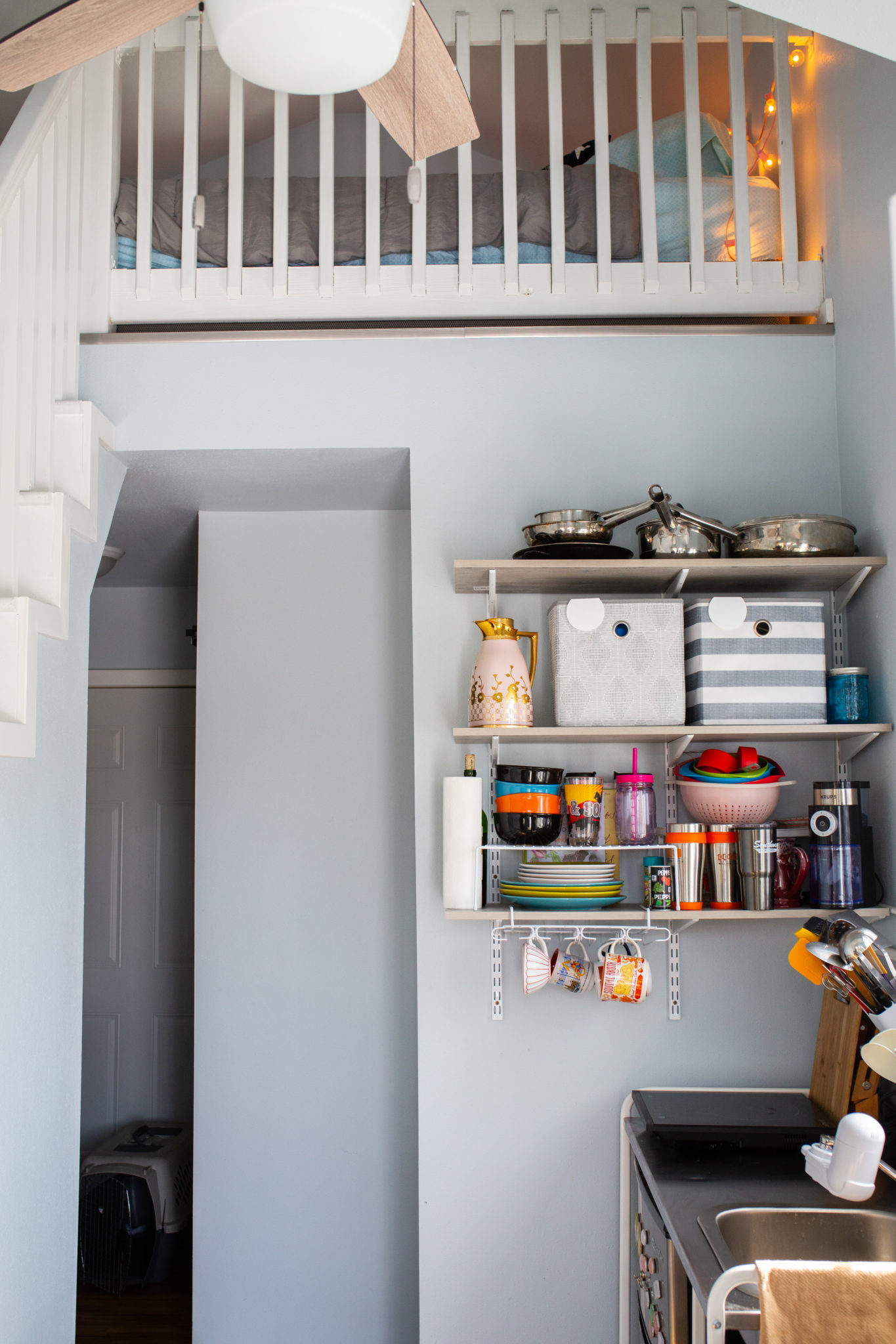 The best part of living in her tiny home so far? “There’s so little to clean! And everything I own has been specifically chosen by me to have in my house, so that makes what I do own very special.” Leslie is honest about the challenges of tiny-home life too. Her bedroom is in the loft, and it was strange to sleep in such a high, open area right away. Keeping things clutter-free, maximizing storage, and hosting guests are other things she is learning as she goes. “I had a few panicked moments of claustrophobia when I first moved in, but those have long subsided. It’s very cozy and I really enjoy my little space.” // –Jenny Roth