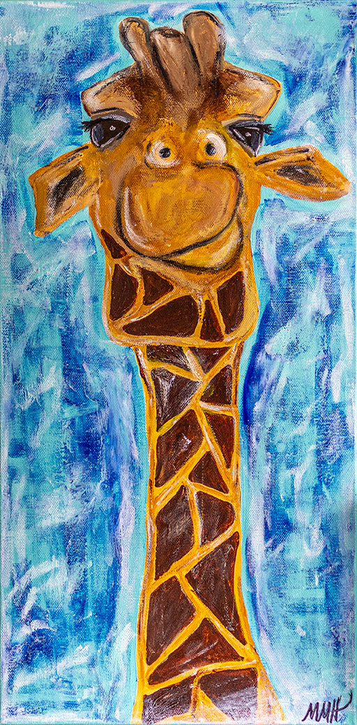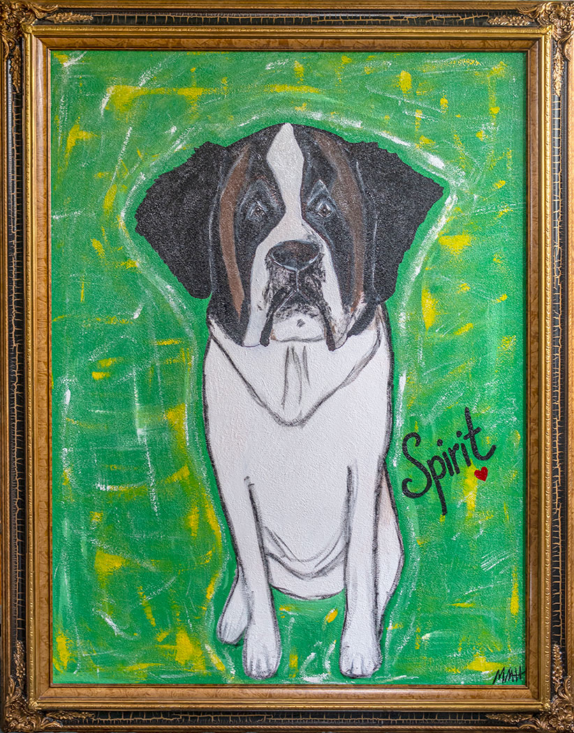 Molly has been painting and doing one art project or another for most of her life, a knack she likely picked up at a young age from being in 4-H and watching two of her aunts work as professional artists. Her first public art show, “Color Me Happy,” is on display during the month of July at Presentation College’s Wein Gallery. Just like its name implies, the show is full of both color and cheer. She says, “It’s a great show for kids, too, because it’s very colorful and fun with a lot of animals.” Dogs and cats, including Spirit, PC’s St. Bernard mascot, are center stage in “Color Me Happy,” along with the occasional giraffe and elephant sprinkled into the mix. Molly calls these pet portraits “Pico paintings” as a tribute to the chihuahua who started it all. She explains, “A close friend lost her chihuahua, Pico, and she was so sad. I wanted to do something to cheer her up, so I painted him and sent it to her and she called me crying and said, ‘I love this so much.’ After that, I started doing more paintings for people whose pets had passed away.”