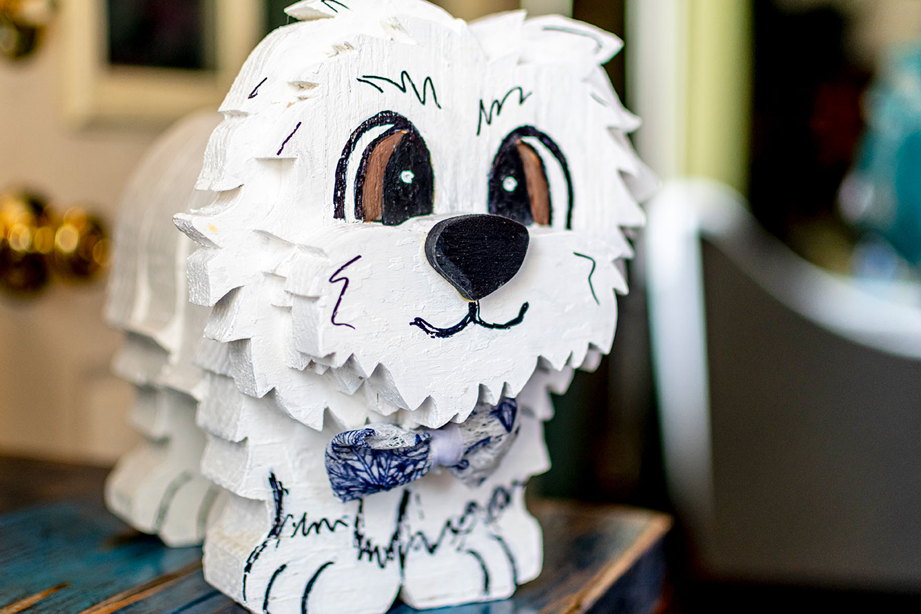 Seeing how Molly dedicates her career and volunteer time to caring for others, it’s no surprise her paintings do the same. She says, “To know I can make somebody else’s day by giving them a painting of a dog they loved—that’s the best.” Where does her compassion for people come from? The Aberdeen native credits her parents and family. She says her mom, a nurse, and dad, who worked for the post office, taught her and her three sisters to always look out for people and also to have a strong faith. Her twin sister, Jennifer Phillips, made the felt, leather, and paper flowers placed throughout her art show display, where all the animals are named after flowers.