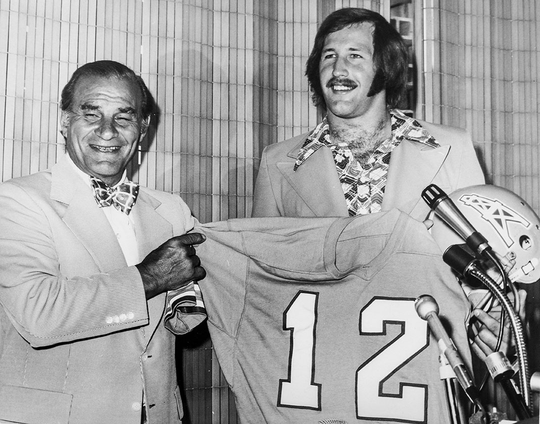A quarterback in high school, George first played running back in college due to injuries on the team. As a junior, he set a team record, rushing for 1,316 yards and 15 touchdowns, and led the Cyclones to their first-ever bowl game, the 1971 Sun Bowl. As a senior, he returned to quarterback—“My love, because I like to be in charge”—and became the first player in school history to top 2,000 yards in total offense. Against Missouri, which Iowa State hadn’t beaten in years, George led the team to a big victory. Late in the game, Coach Majors wanted George to take a knee. Instead, “I called a quarterback sneak,” George laughs. “I yelled at Coach that taking a knee would hurt my average!” George was named the 1972 Big Eight Conference player of the year, beating out Nebraska’s Johnny Rodgers, who won the Heisman Trophy that year. George finished seventh in the Heisman voting.