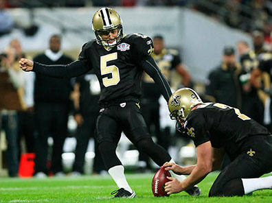 Taylor Mehlhaff kicks a goal during an NFL game between the San Diego Chargers and the New Orleans Saints in 2008.