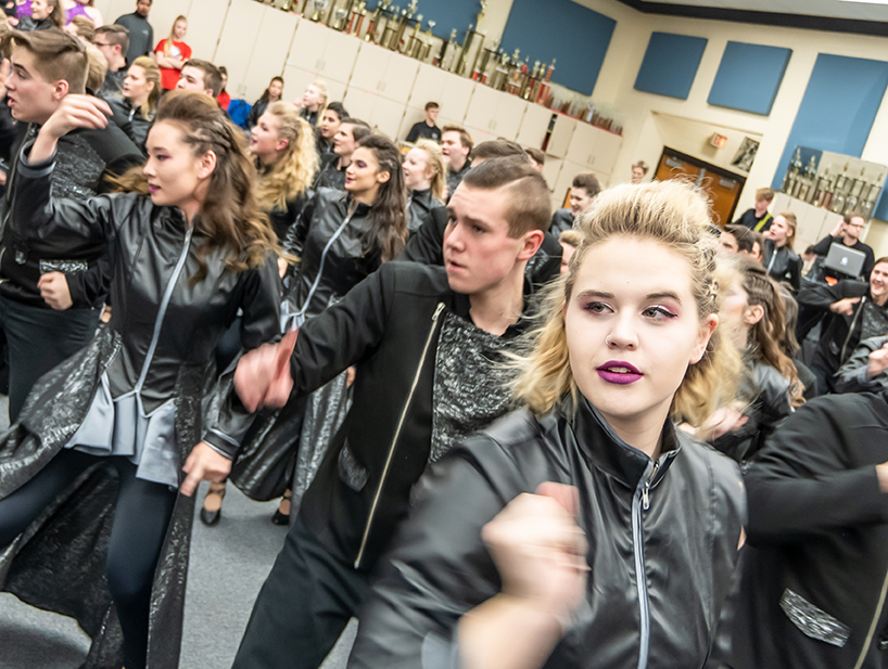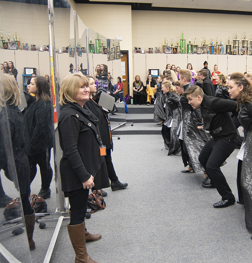 During performances, groups are being watched by judges who are often in the back of the theatres. The judges score different aspects of the show and later compare them to the other show choir groups at the competition. At many competitions, six groups with the highest overall scores are chosen to compete again in finals. Ms. Rostad noted that vocals always carries the most significant weight in the judges’ scores, after all, it’s not just a show; it’s a show choir. Choreography is typically the next highest weighted scoring consideration. Some other things that judges look at for scoring include costumes, facials (despite trying to sing in perfect harmony and coordinating that music with complicated dance moves, you must also smile or clearly demonstrate other emotions on your face the entire performance time – much harder than it sounds!), band, and show design. Ms. Appl works hard to build those final layers of the performance by playing a game called “Last Man Standing” where you are eliminated if you are caught without your energy showing in your face or dance moves until only one remains. Ms. Appl said, “If your facial expression doesn’t feel ridiculous, you’re not doing it right!”