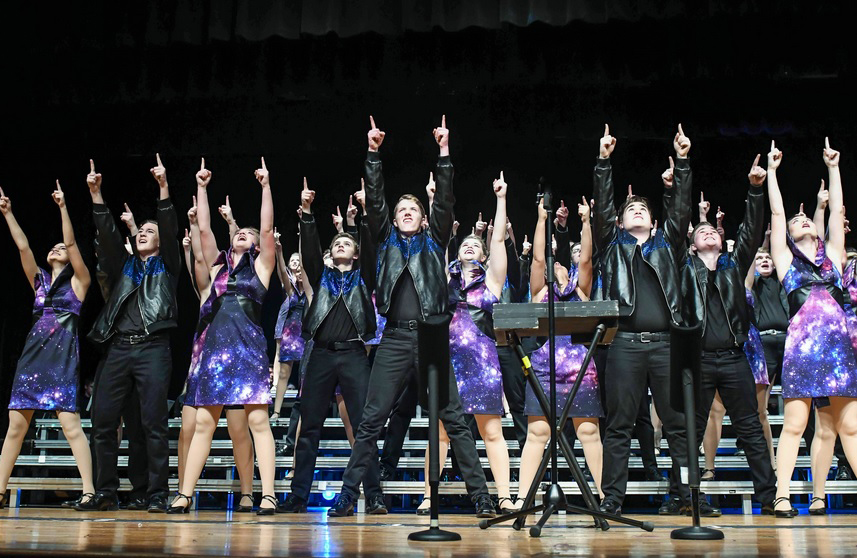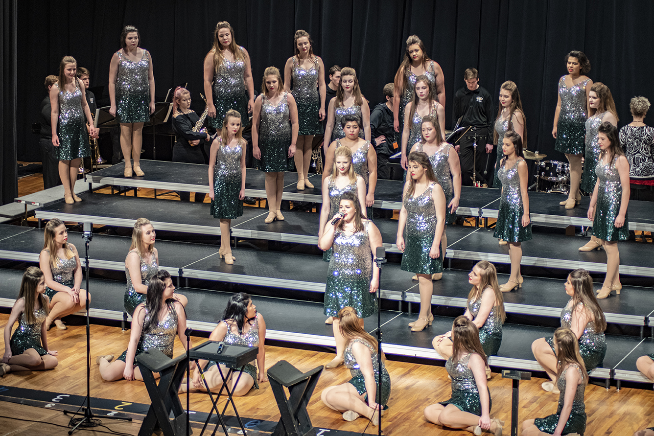 You’re sitting in a darkened theatre when, suddenly, a performance is announced. Kids in sparkly, snazzy outfits flood the stage as other kids cheer wildly in the first few rows of the audience. The drumsticks click to set the beat and harmonized music and dazzling motion suddenly fills the venue. Every aspect of the performance draws you in. The group strikes what seems like their final pose, but then explodes into a high-energy encore as the audience hits their feet for a standing ovation. The show choir members exit the stage in a flash of sequins and jewels, leaving you wanting more. This is show choir, but there is so much more preparation that builds up to that heart-stopping performance, involving dozens of students and volunteers during a season that lasts almost the entire school year.