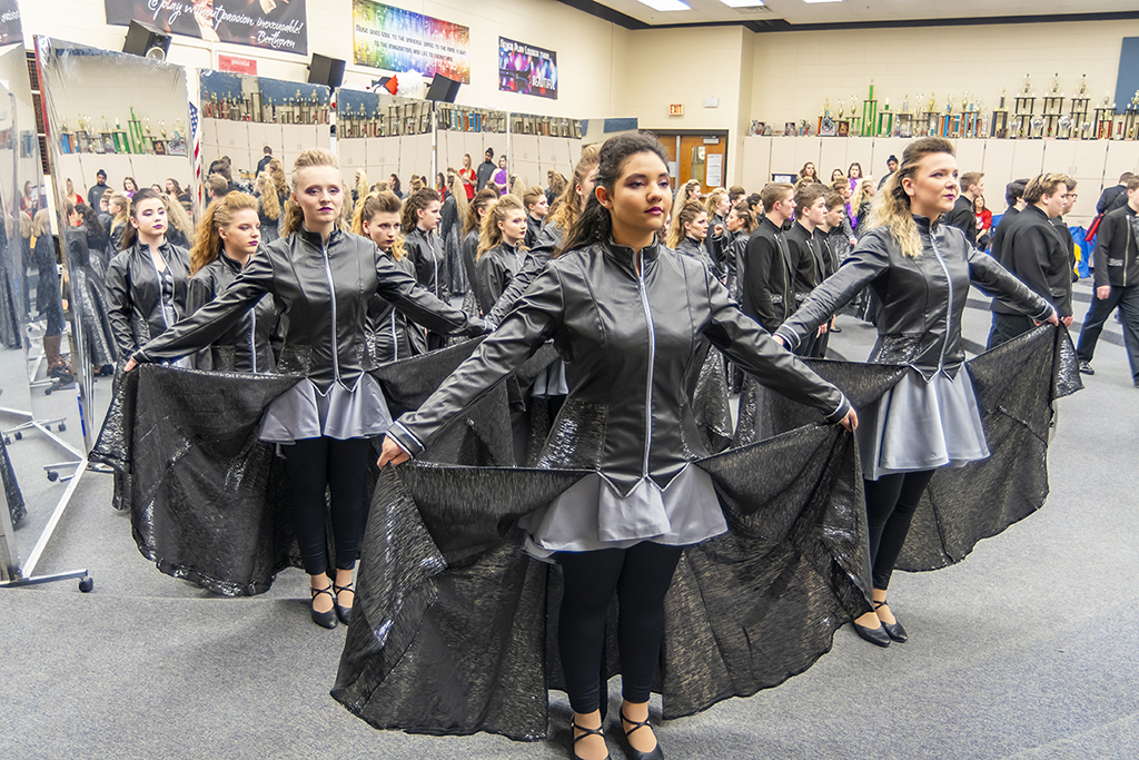Once the show is all put together and polished and the groups start to practice in full costume with costume changes mid-performance and then it’s time for the teams to compete. Groups often have to leave extremely early in the morning for out of town competitions. Kids sleep on the bus if they had a very early equipment load time to rest up for the long day. Otherwise, there’s a lot of life and excitement, filling the buses with voices and laughter. Depending on where the competition is located, this year with two of the competitions in Iowa and Nebraska, bus rides can feel excruciatingly long.