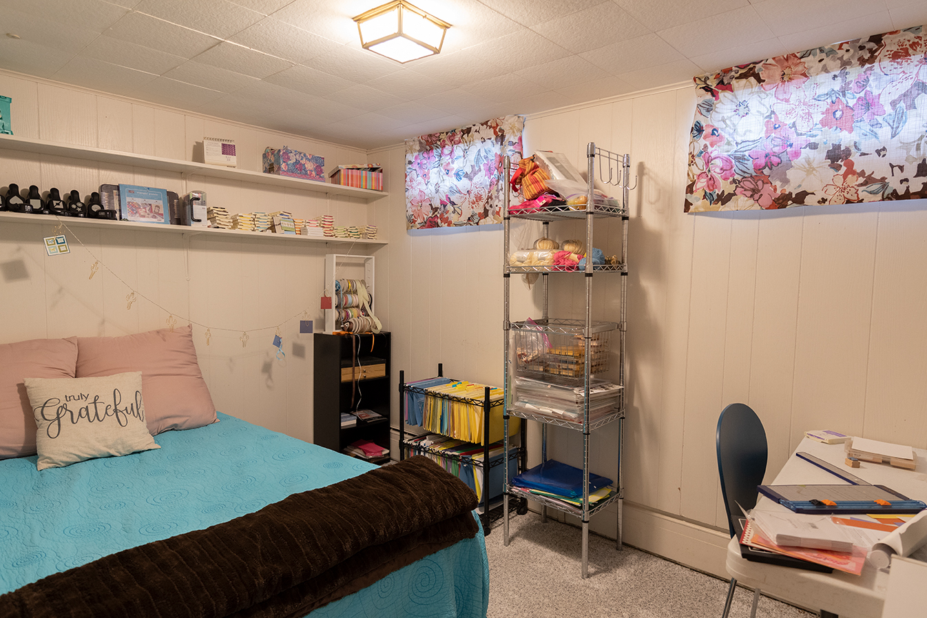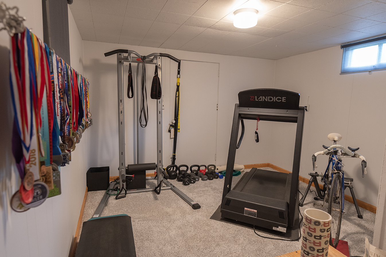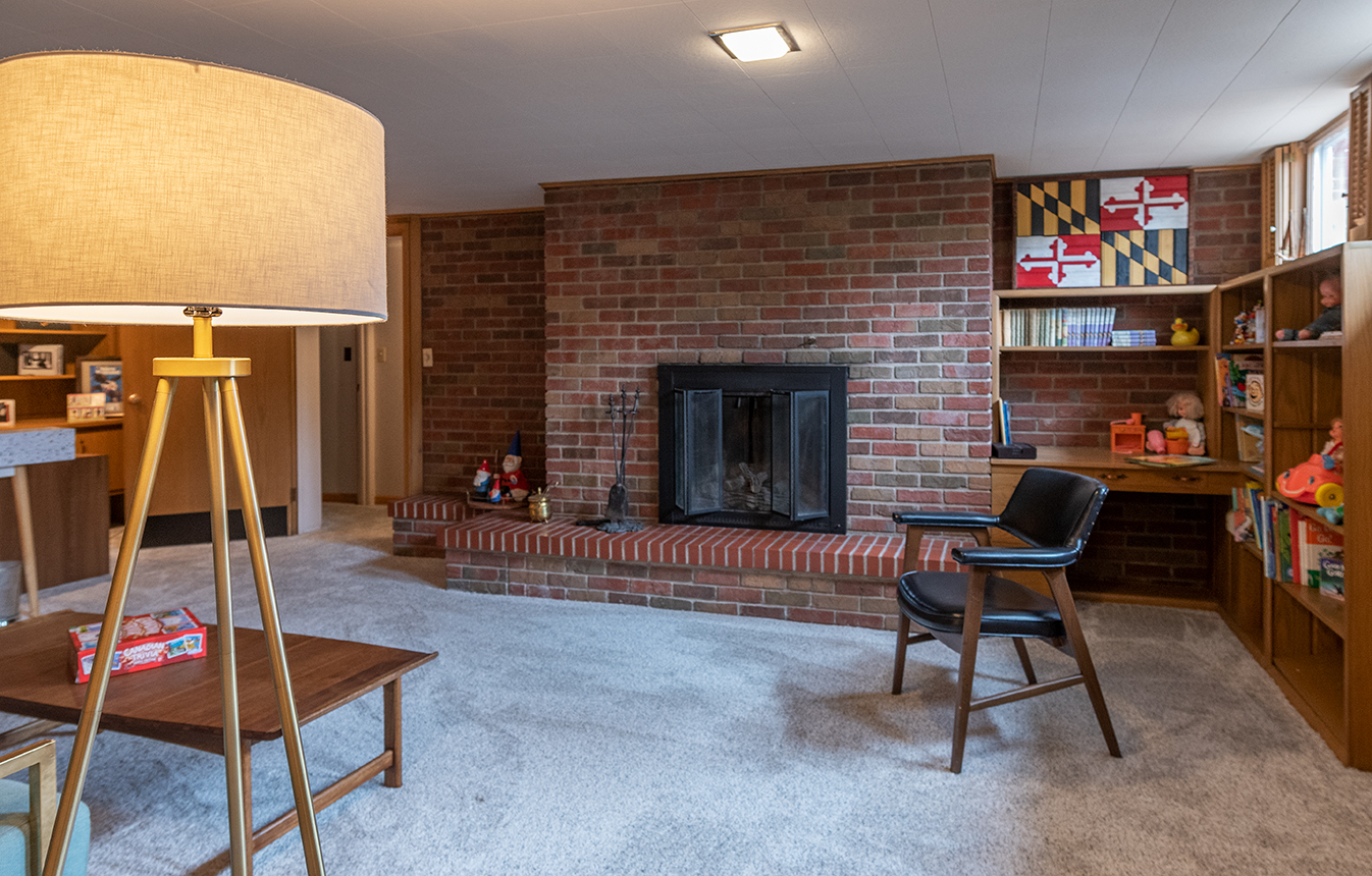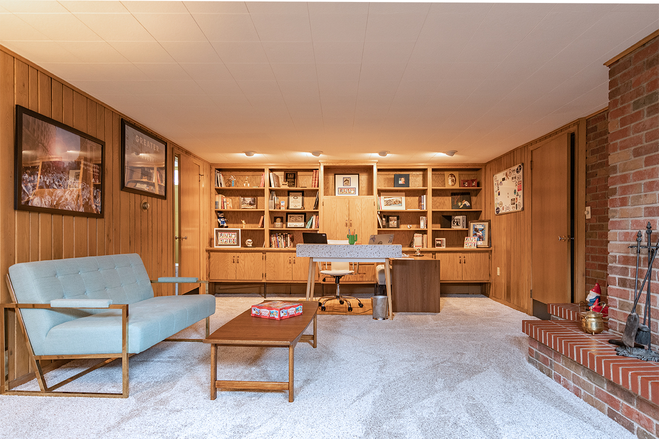 “I needed specific spaces for a home office and gym,” Pam states, “so I just loved the basement.” The basement living room provided the space for a dedicated office complete with natural light and built-in bookshelves. It even has a working fireplace that she used in her first winter here a few months back.