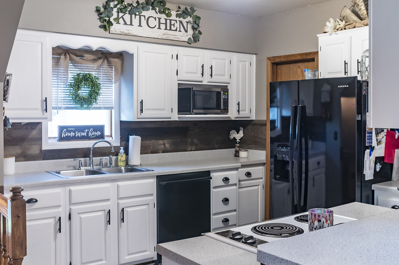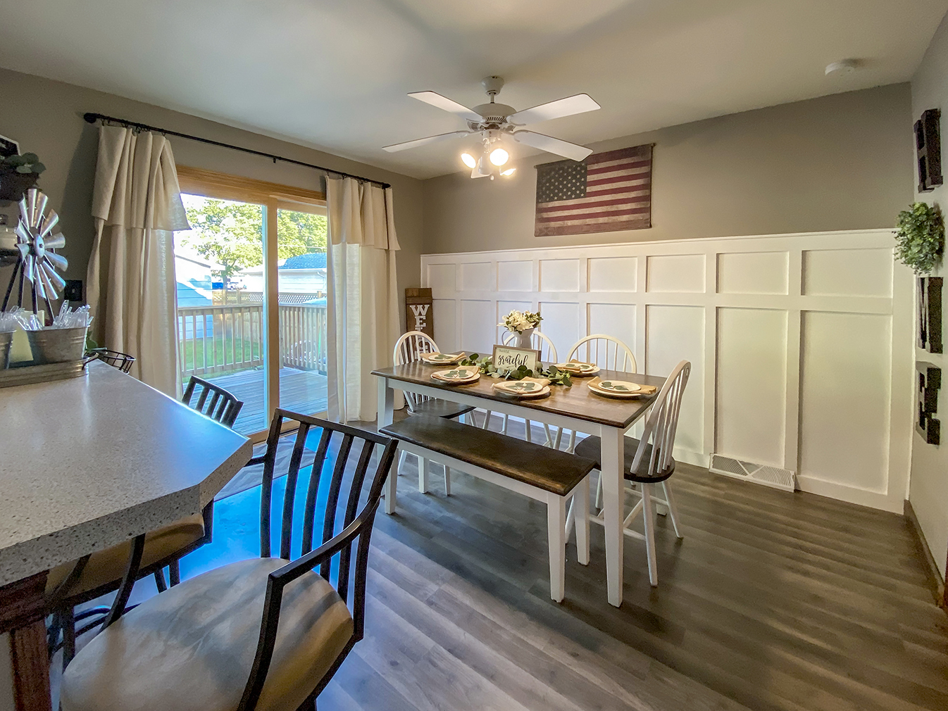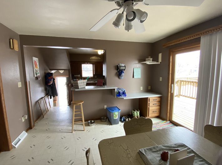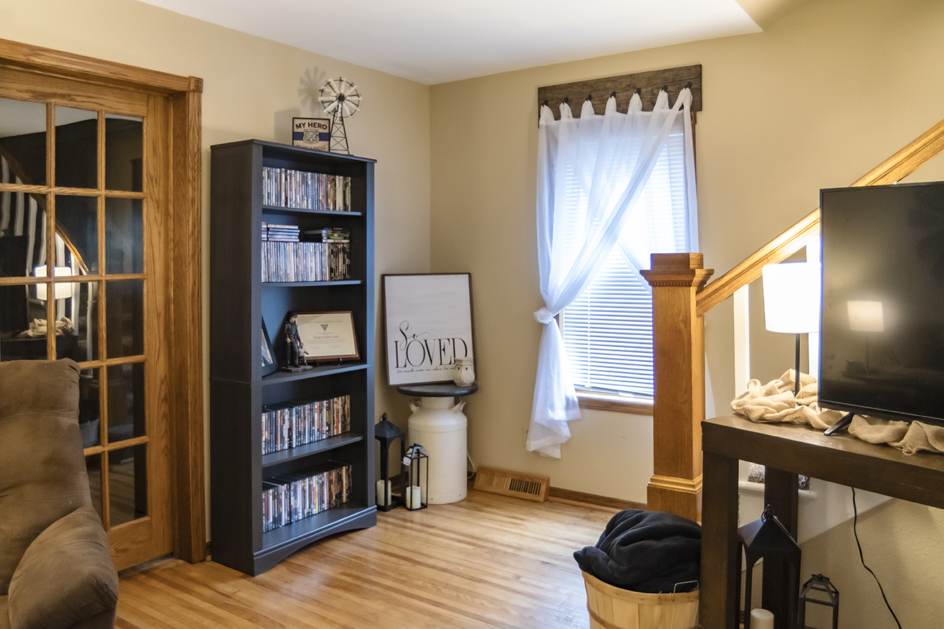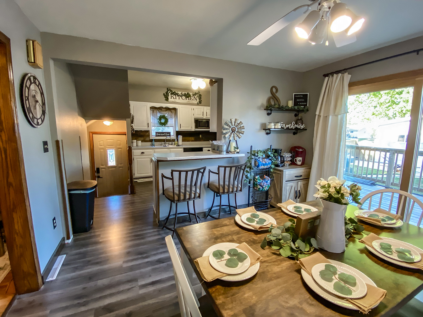 The kitchen needed the most updating. The cabinets were painted a farmhouse white, new flooring and a fridge were installed, and décor pieces were added to give the room some personality. Stephanie says the old kitchen and dining room felt very dark and small before the updates, and now both rooms feel much brighter and welcoming.