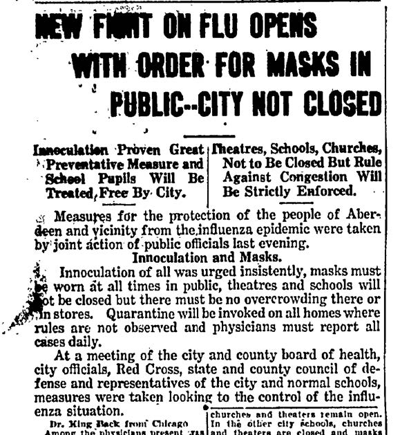 The city attempted to mitigate disease spread. While minutes show the City Commission took no action regarding the flu, others did. On October 11, a week into the epidemic when Aberdeen had about 200 cases, Mayor A.N.