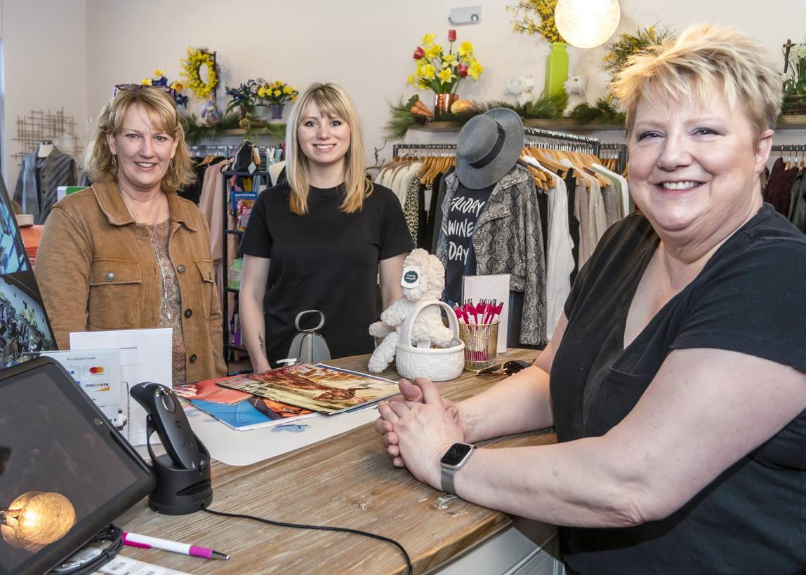 Sales representative Julie Lillis (left) works with Kiernan McCranie and JoDee McCranie of Skal Moon to plan a magazine ad for the business.