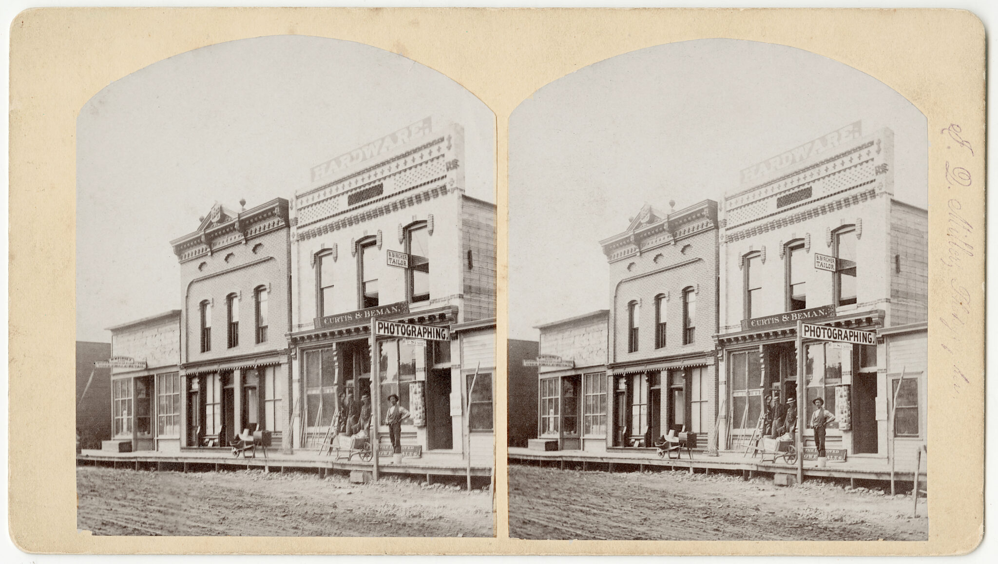 I couldn’t find a tremendous amount of info on Curtis and Beman other than they both came from Auburn, NY, and started a retail/wholesale business of stoves, lubricants, gun powder, and hardware. They had two warehouses near the tracks but decided to open a store on Main Street too. However, they quickly abandoned the retail trade and went strictly to wholesale, leaving this location by 1885. Beman’s wife died in 1886, and he disappeared from the Aberdeen scene soon after. Curtis moved to Chicago in 1891 but still ran a business here along with H.H. Hungerford. I was not able to determine if this business continued as some other name or eventually dissolved. The 210 building on the left has no markings/signage whatsoever, suggesting it might be brand new. Because Curtis & Beman moved out in 1885, I would date this photo sometime during the years 1884-5. //
