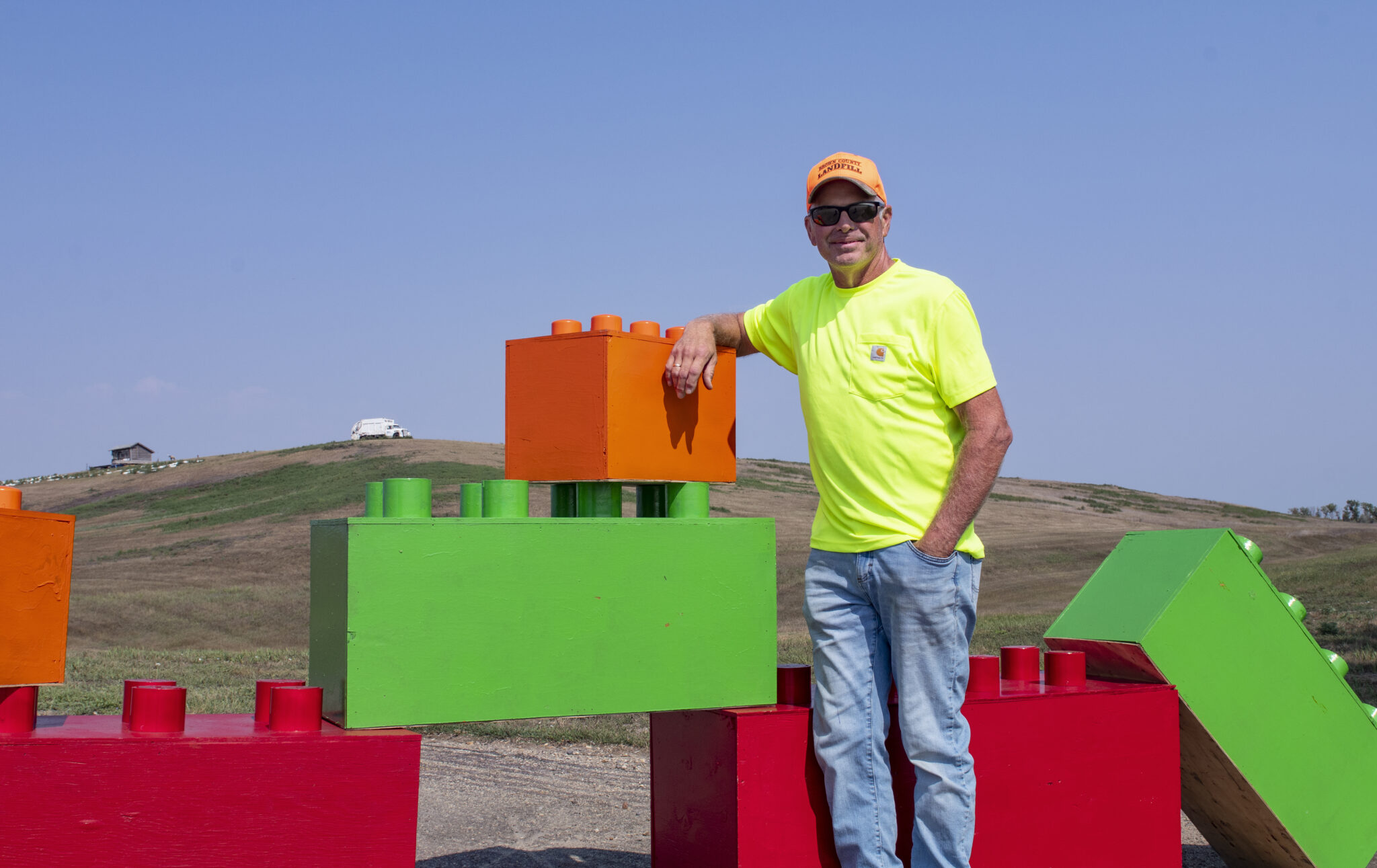 Brown County Landfill Manager Mike Scott leans against “Lego” blocks he created from garbage. He likes to utilize interesting things that he believes still have a little life left in them.