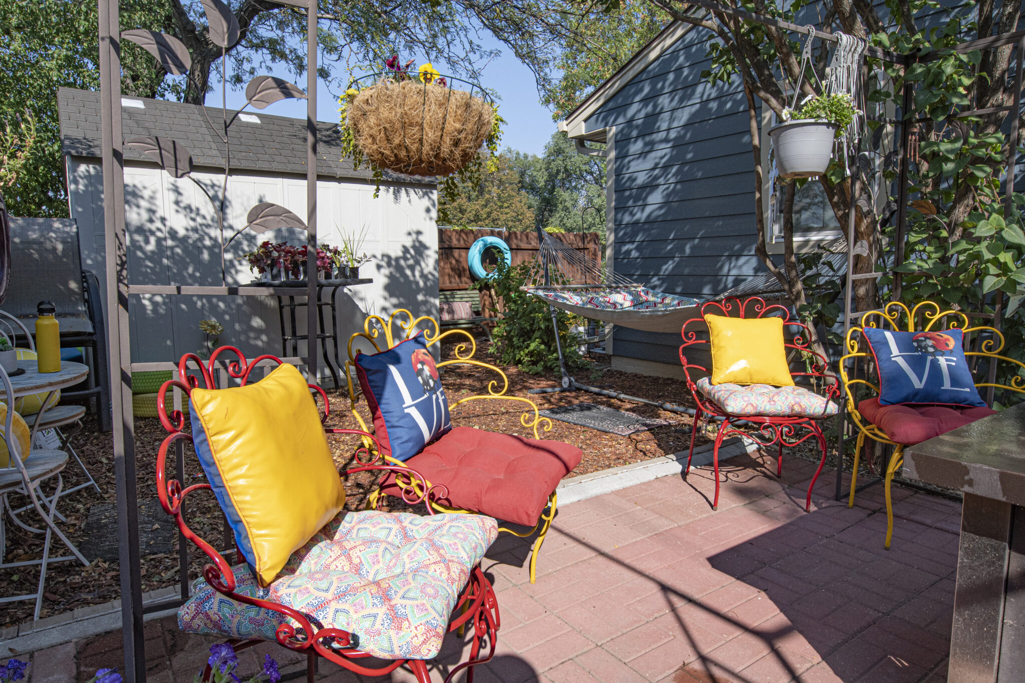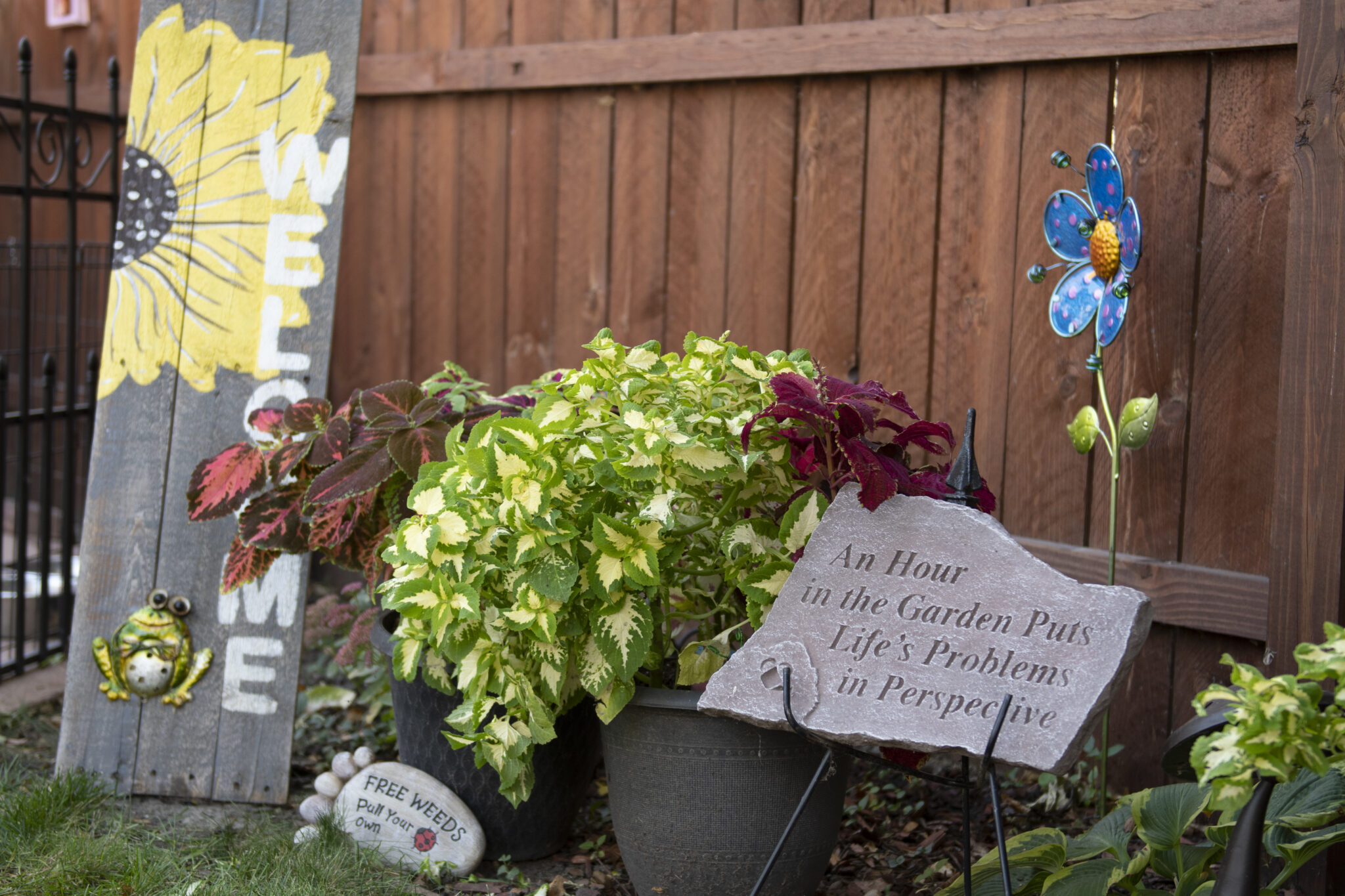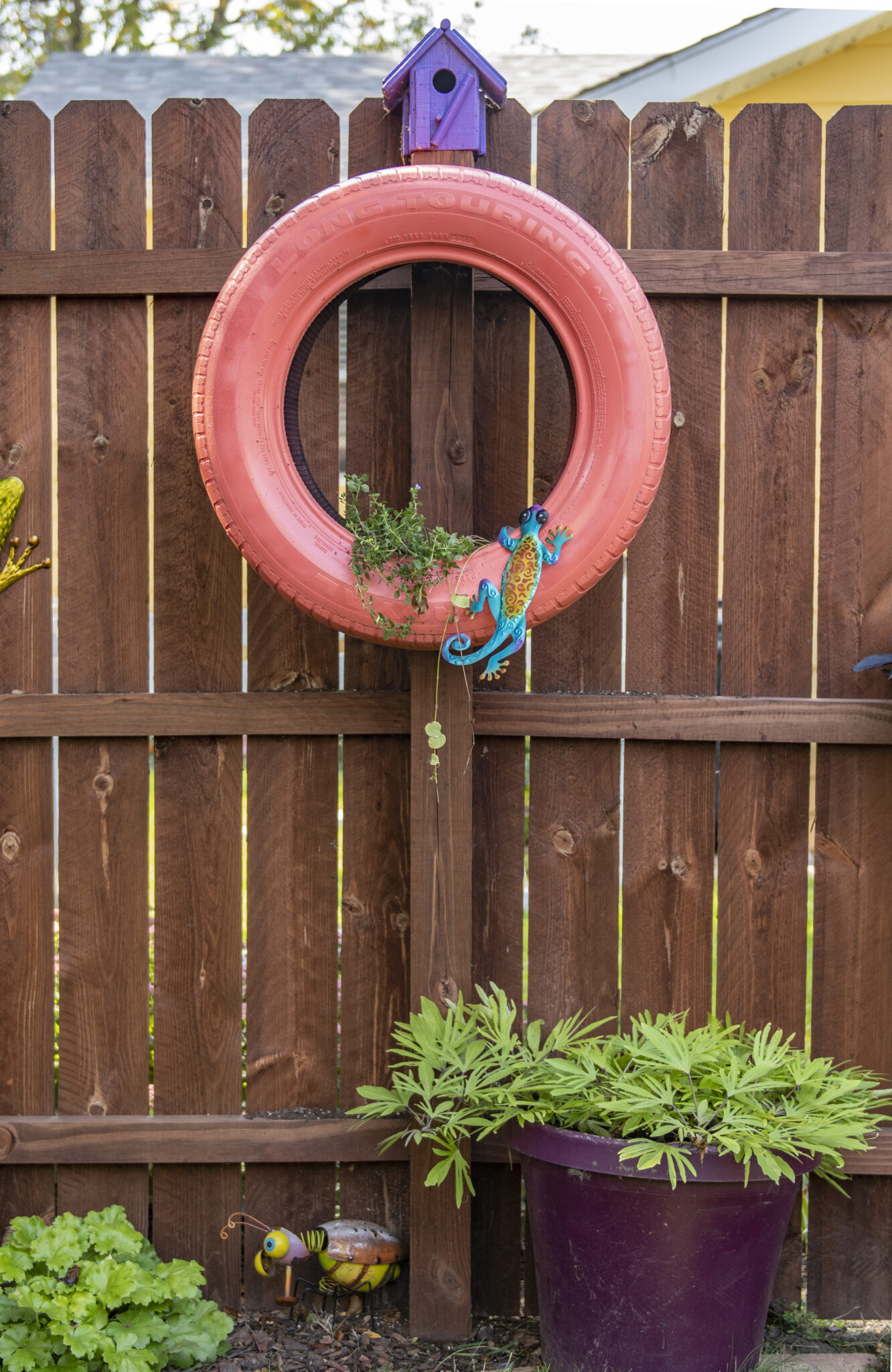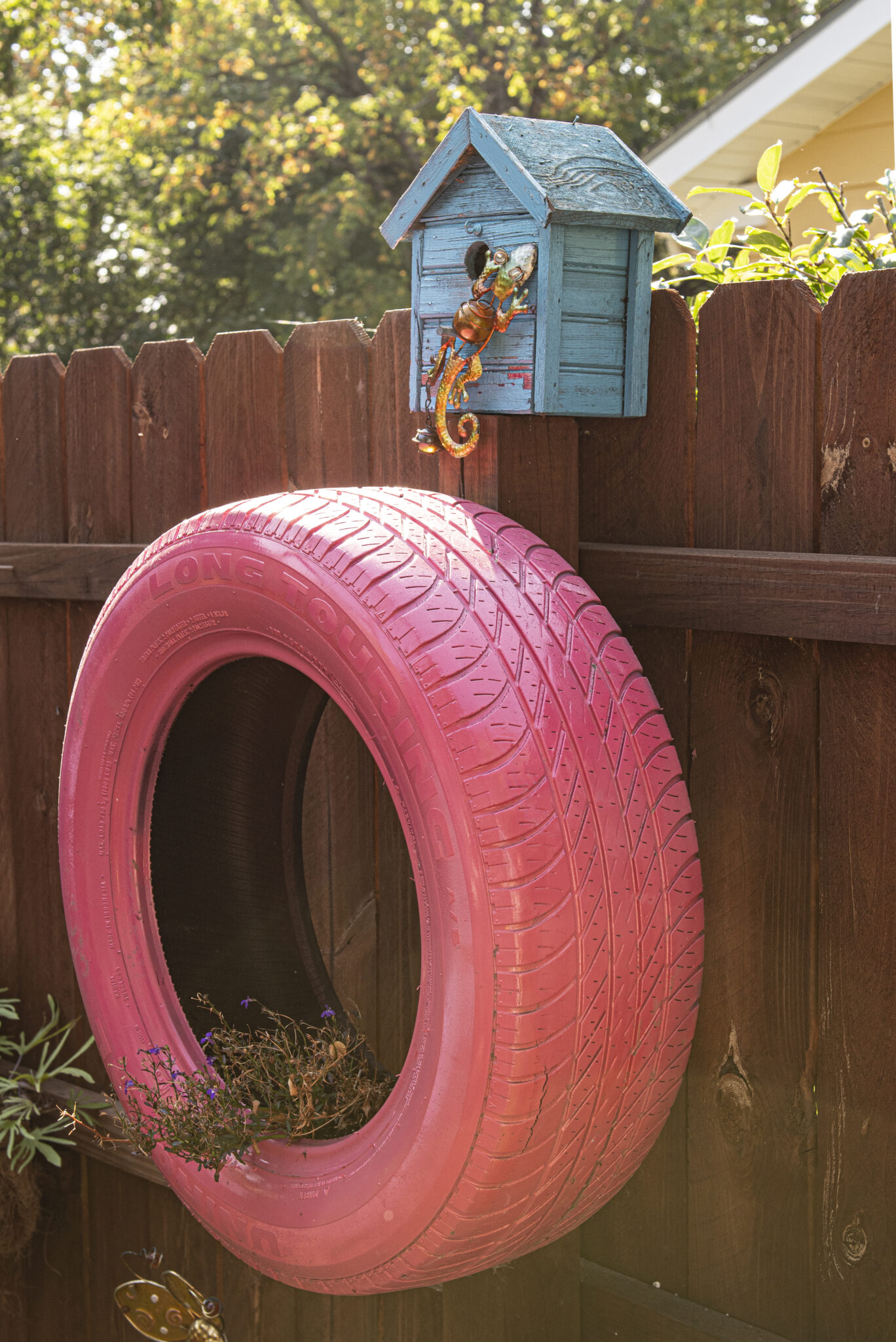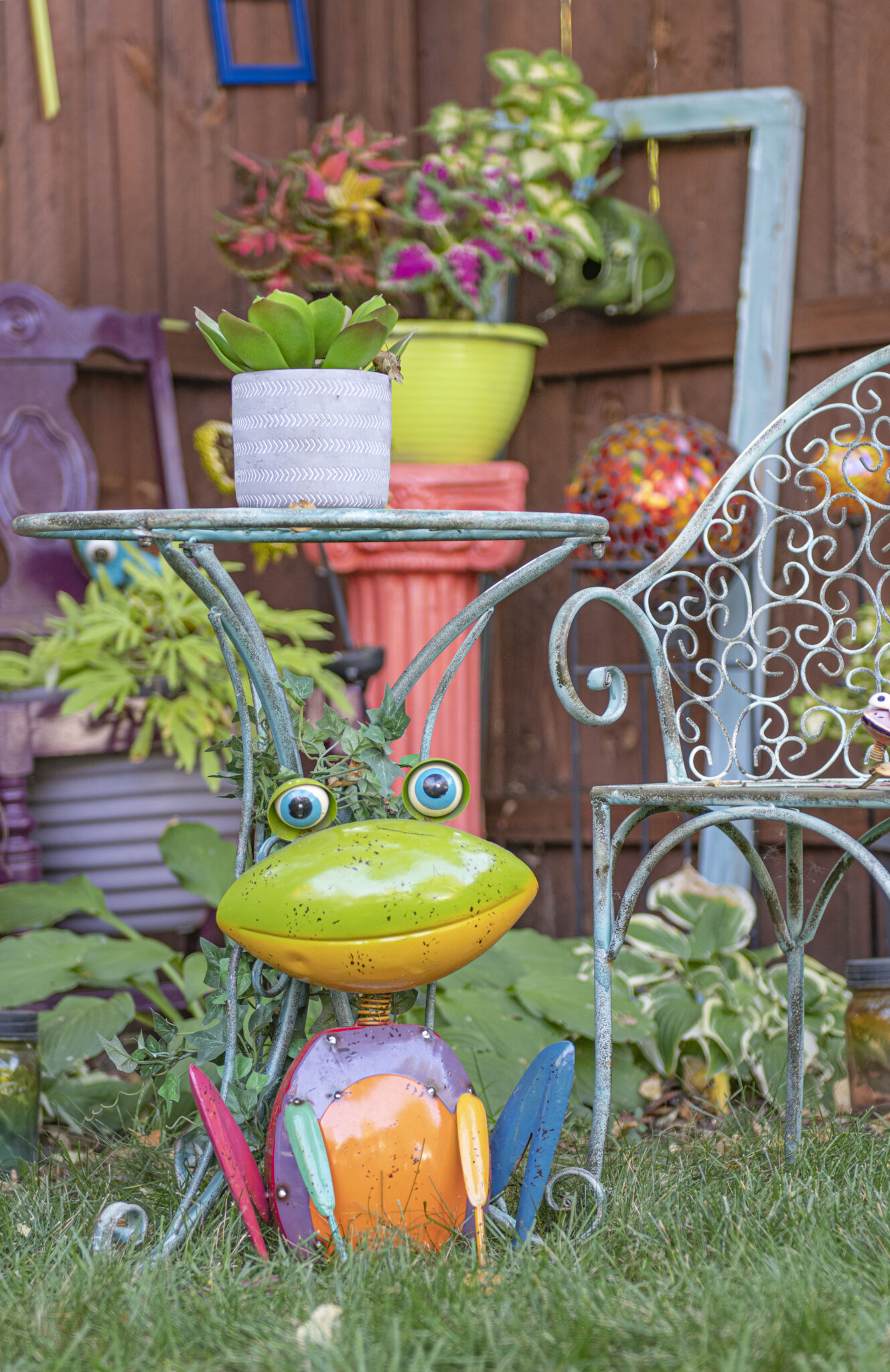 Everyone generally knows that gardening is very therapeutic. Being outdoors, getting dirty, and watching the fruits of your labor revealed before your eyes is very satisfying. Soon to be married, Deatrick LaPointe and Erica Hardy find great joy and calmness in creating an outdoor living space that teases the eyes and is just simply joyful to behold. You might gaze upon a lovely pot with several different types of flowers and be surprised to see a pair of eyeballs looking back at you. All the plantings throughout their front and backyards are accented by little creatures, funky props, and everyday objects coated with vibrant color.