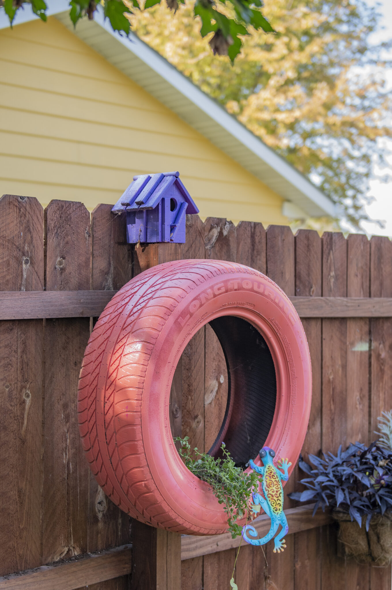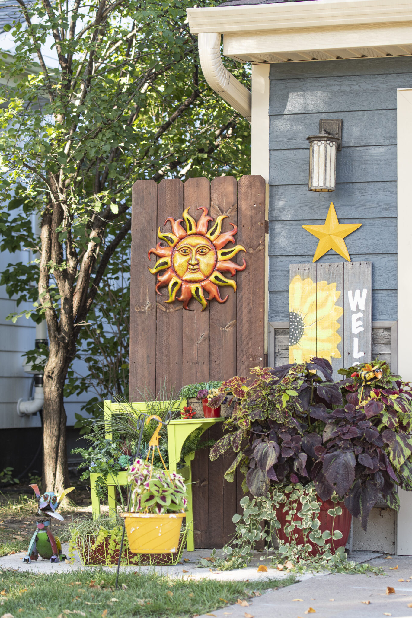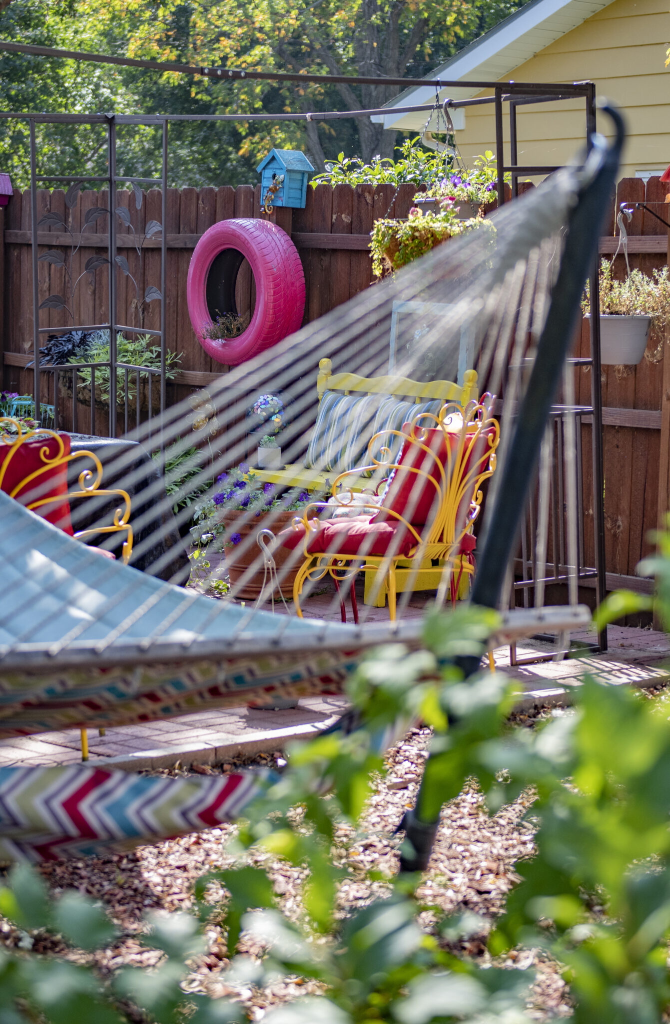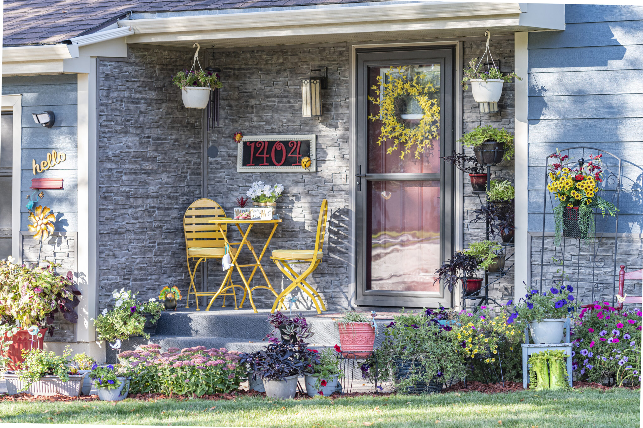 Everyone generally knows that gardening is very therapeutic. Being outdoors, getting dirty, and watching the fruits of your labor revealed before your eyes is very satisfying. Soon to be married, Deatrick LaPointe and Erica Hardy find great joy and calmness in creating an outdoor living space that teases the eyes and is just simply joyful to behold. You might gaze upon a lovely pot with several different types of flowers and be surprised to see a pair of eyeballs looking back at you. All the plantings throughout their front and backyards are accented by little creatures, funky props, and everyday objects coated with vibrant color.