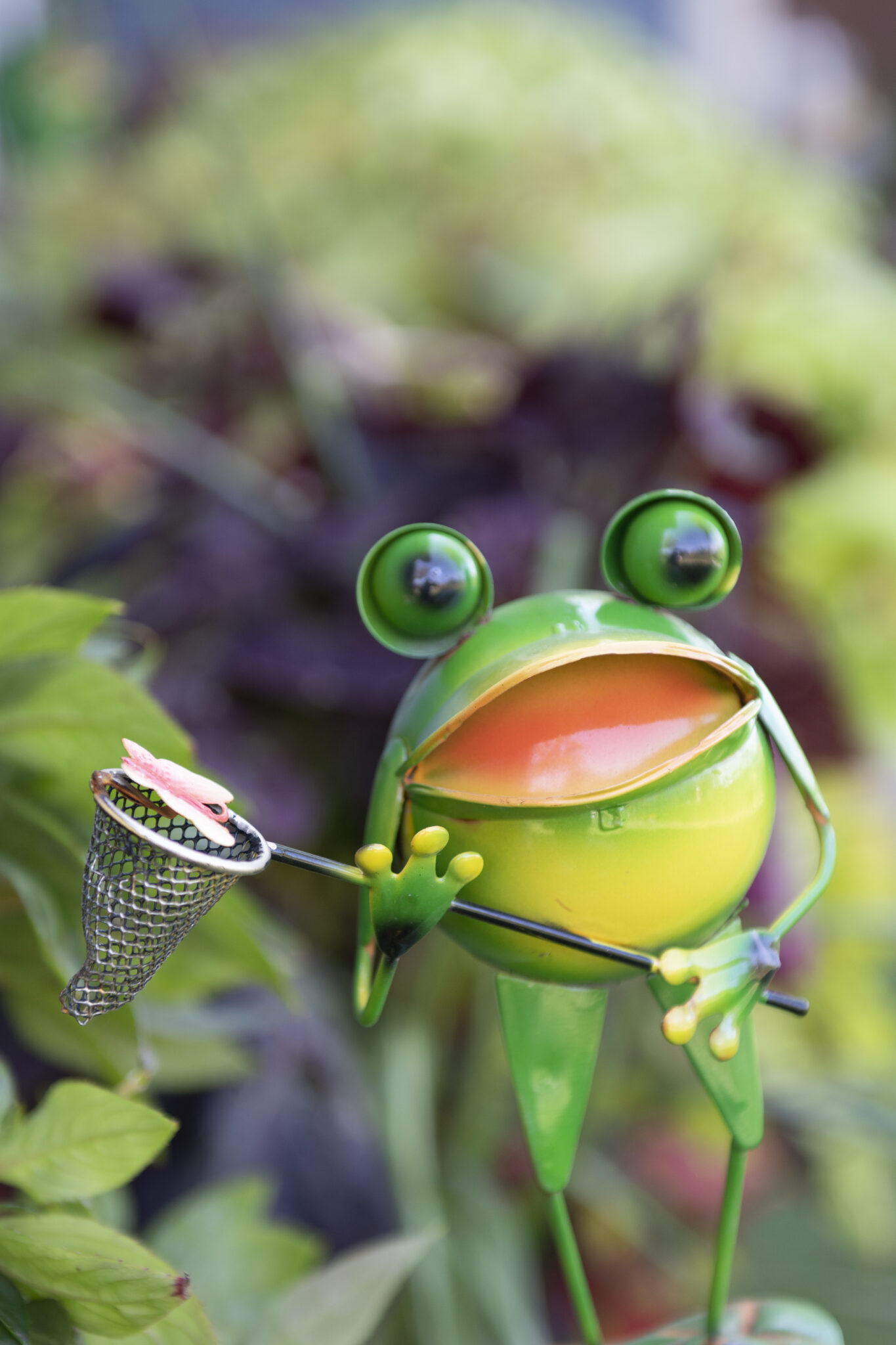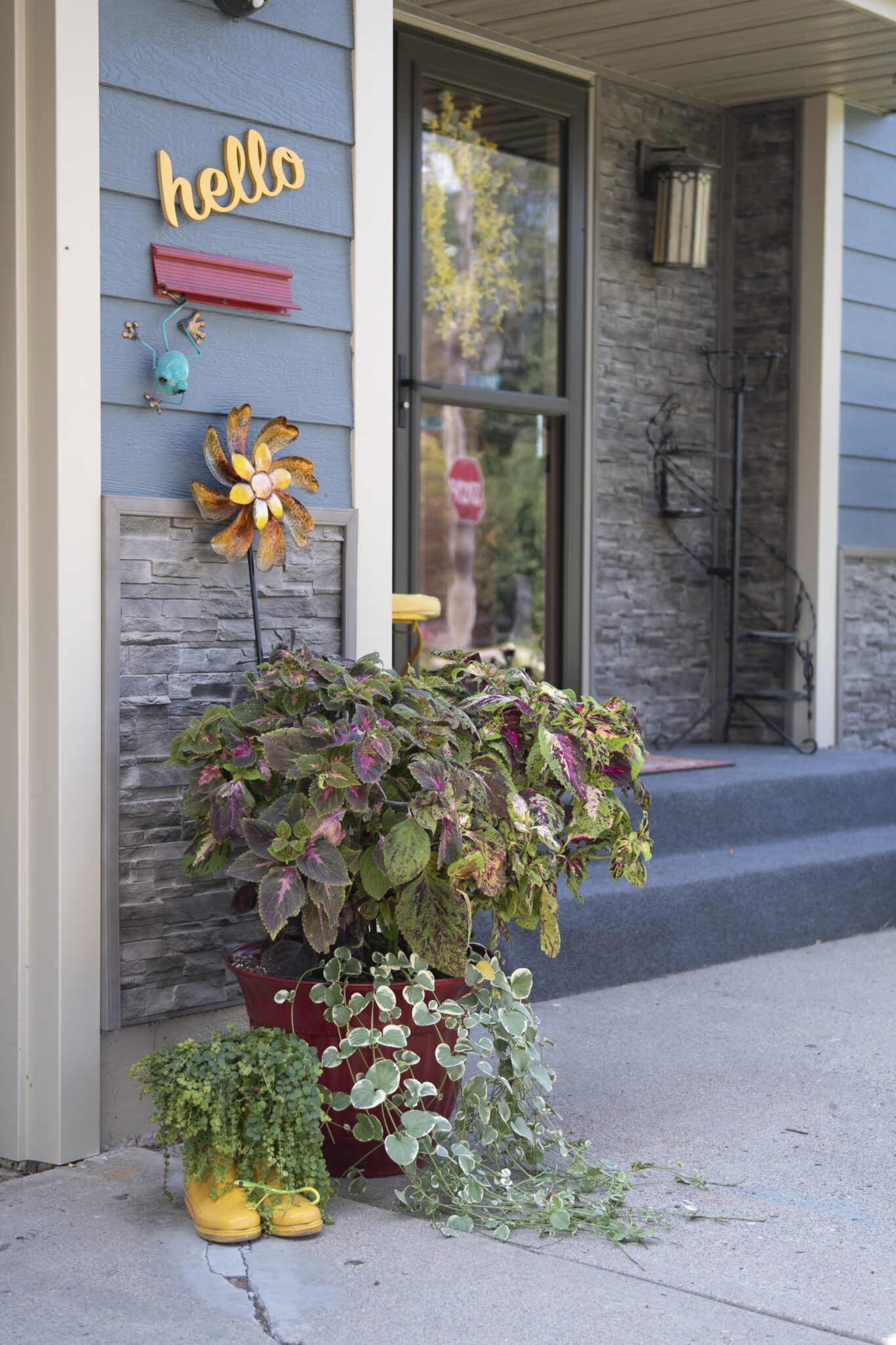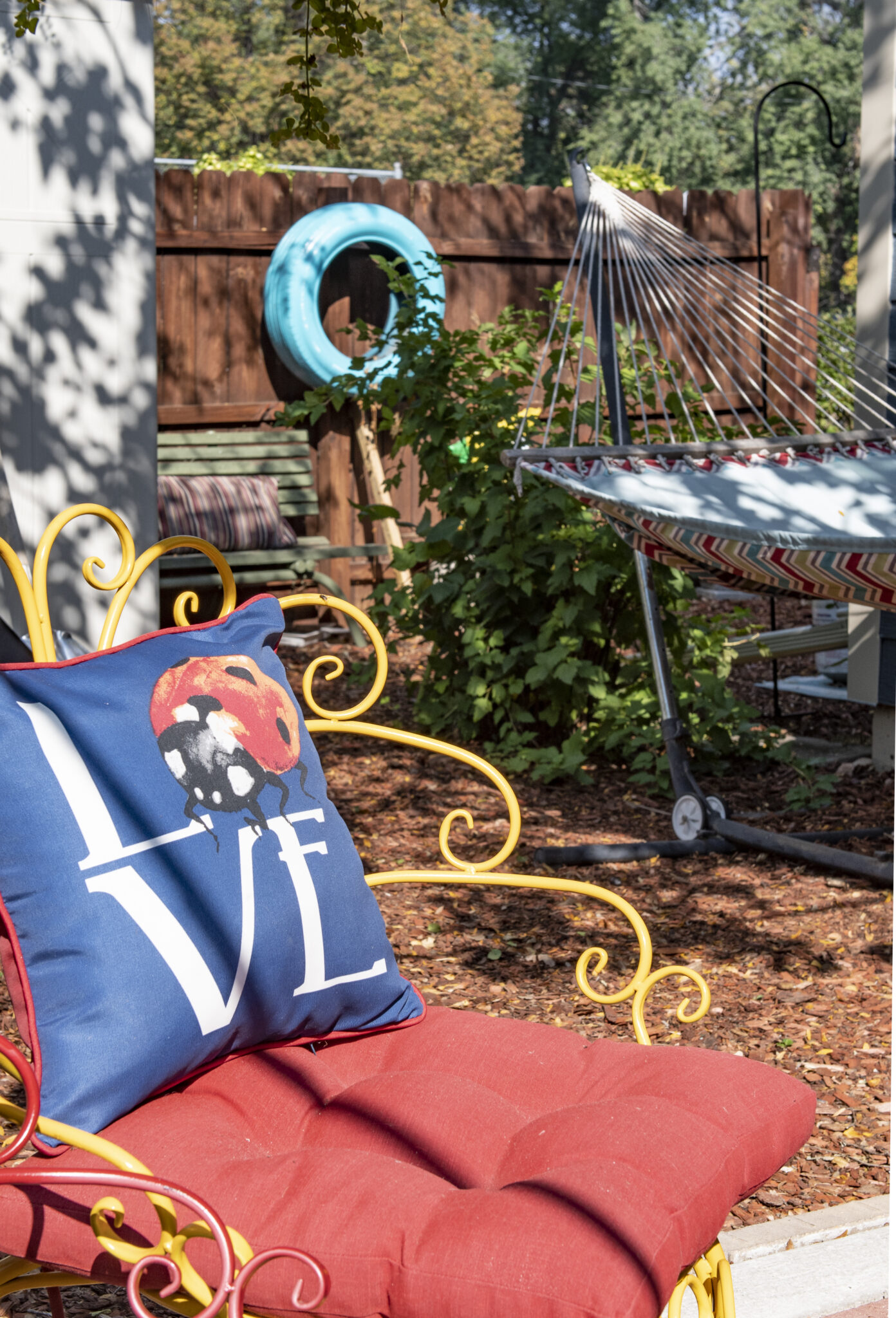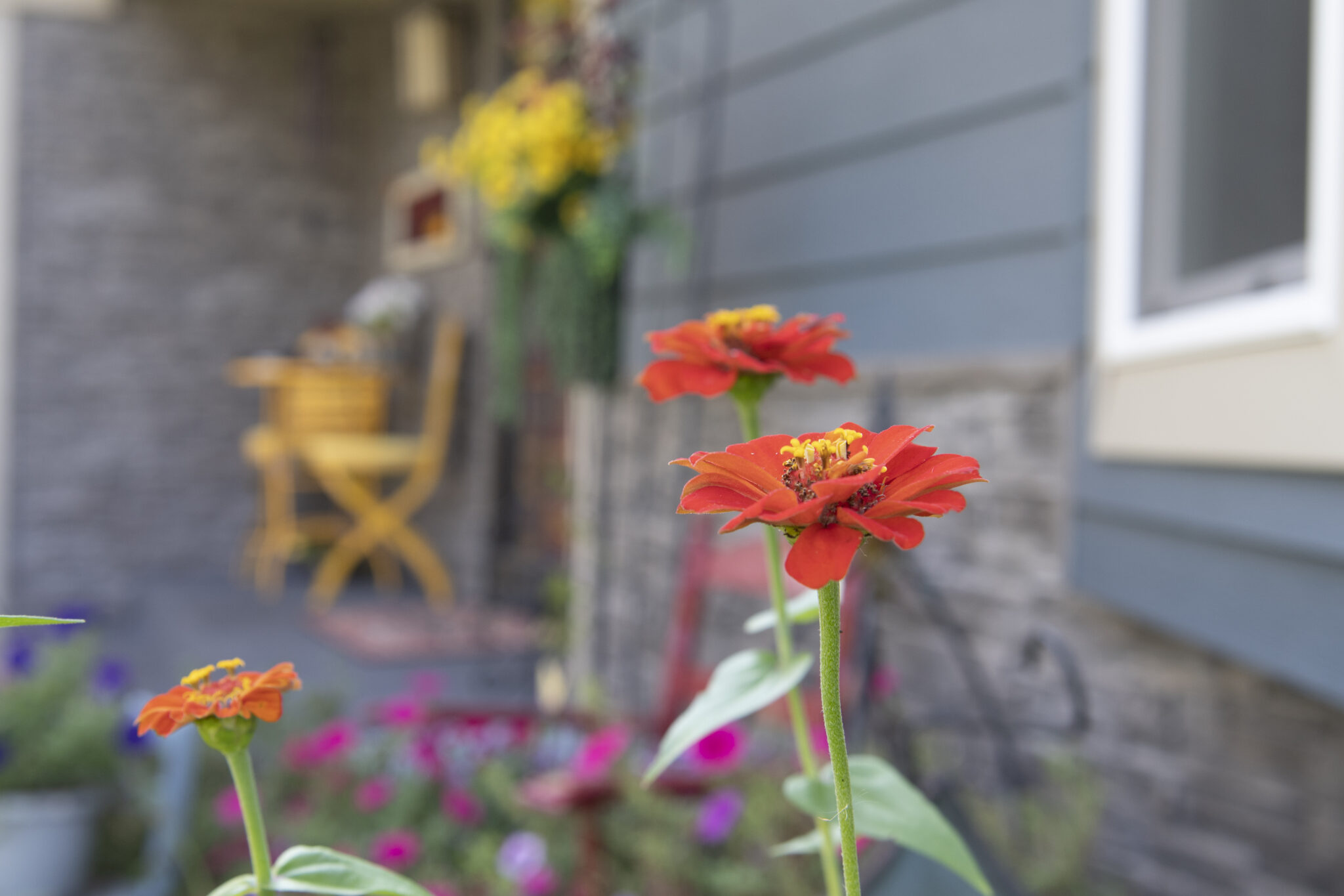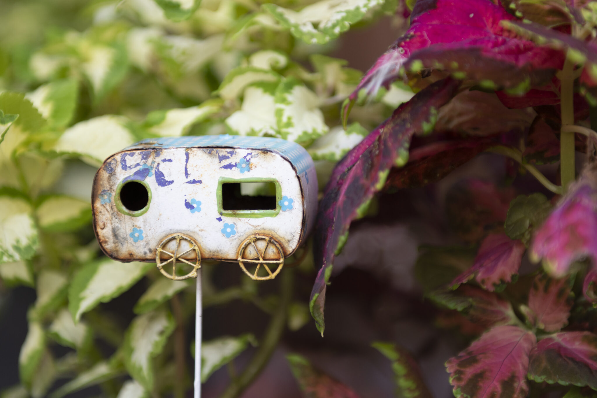 Everyone generally knows that gardening is very therapeutic. Being outdoors, getting dirty, and watching the fruits of your labor revealed before your eyes is very satisfying. Soon to be married, Deatrick LaPointe and Erica Hardy find great joy and calmness in creating an outdoor living space that teases the eyes and is just simply joyful to behold. You might gaze upon a lovely pot with several different types of flowers and be surprised to see a pair of eyeballs looking back at you. All the plantings throughout their front and backyards are accented by little creatures, funky props, and everyday objects coated with vibrant color.
