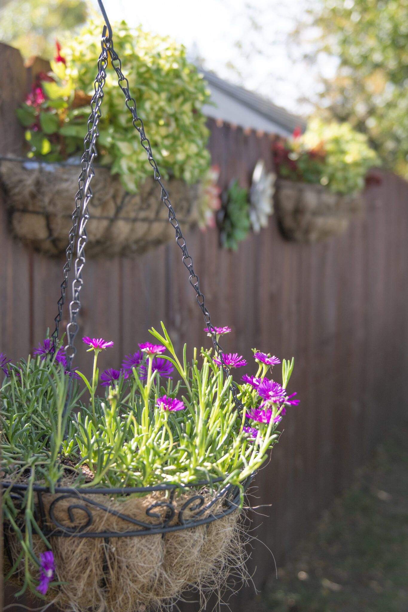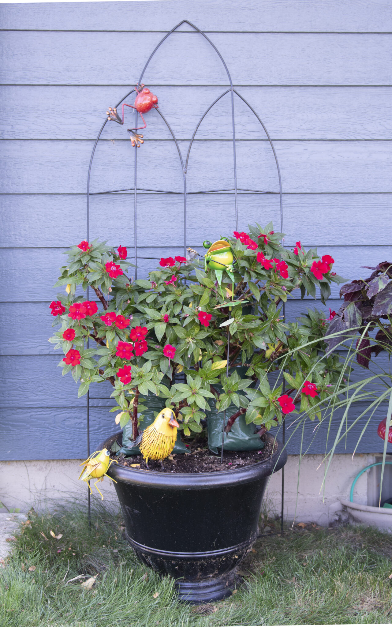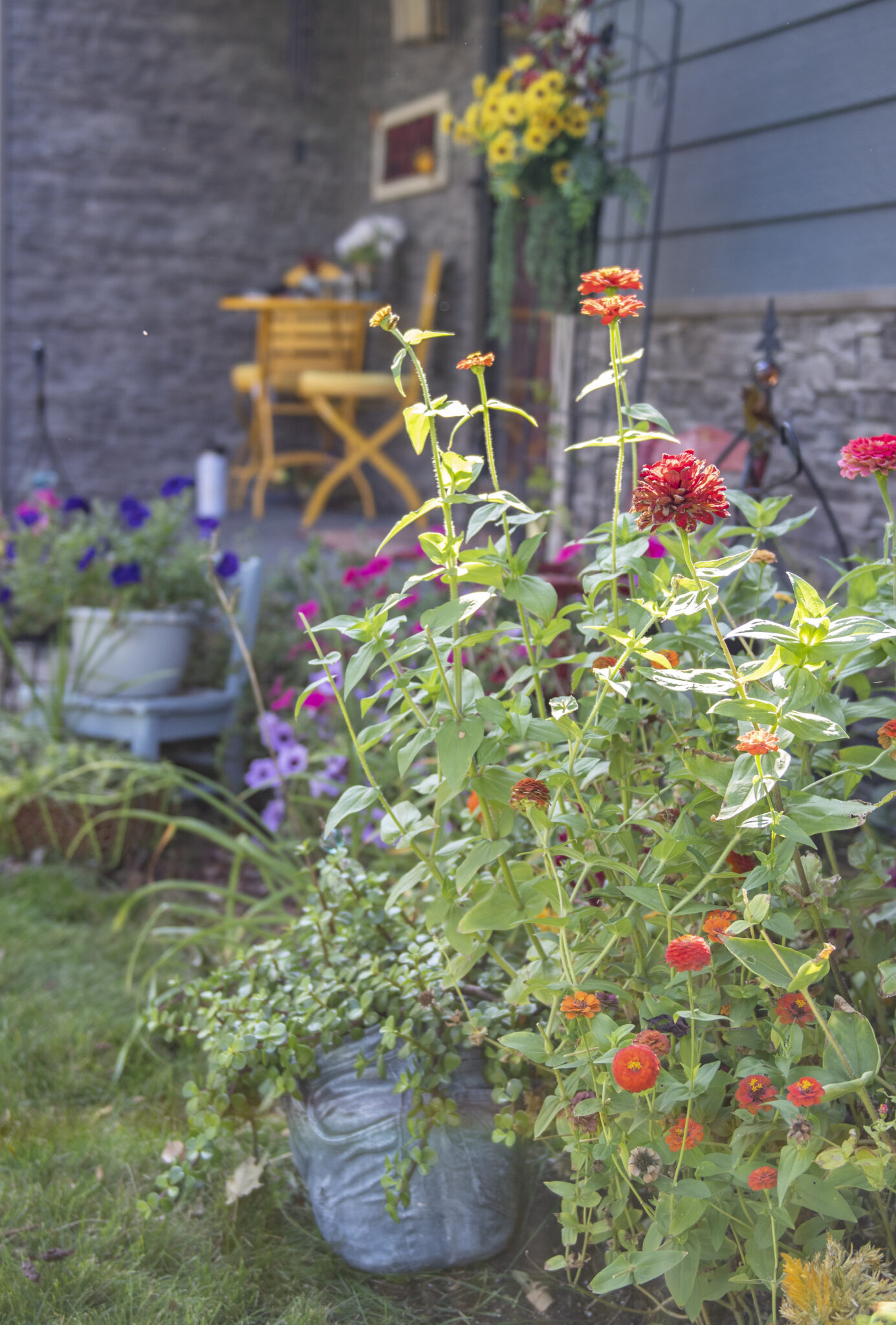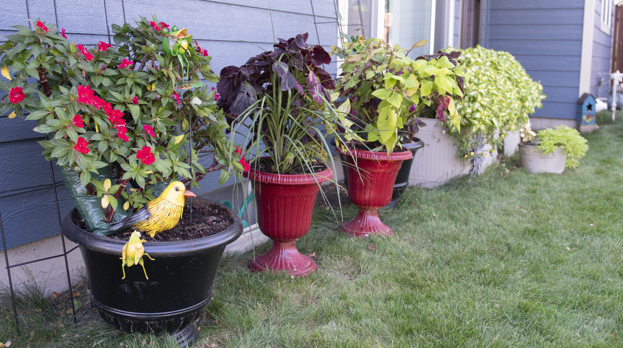 They have taken care to plant and place pots in strategic locations around the yard considering tree and house shade, fencing, turf, and patio space. They remain aware of the soil conditions by supplementing with new soil yearly, then plant perennials and annuals based on the resiliency of each variety.