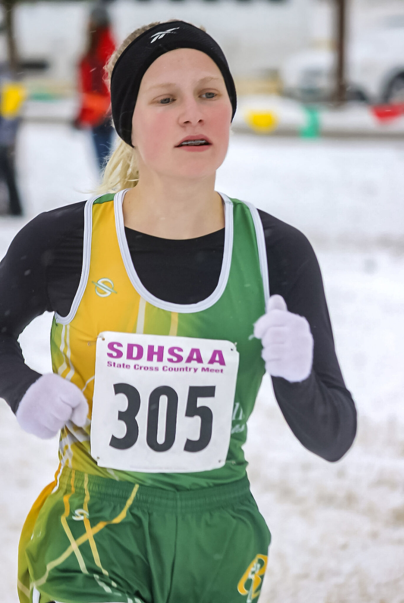 - Paige Schmidt runs in a blizzard at the 2020 State Meet. Photo courtesy of SDHSAA.