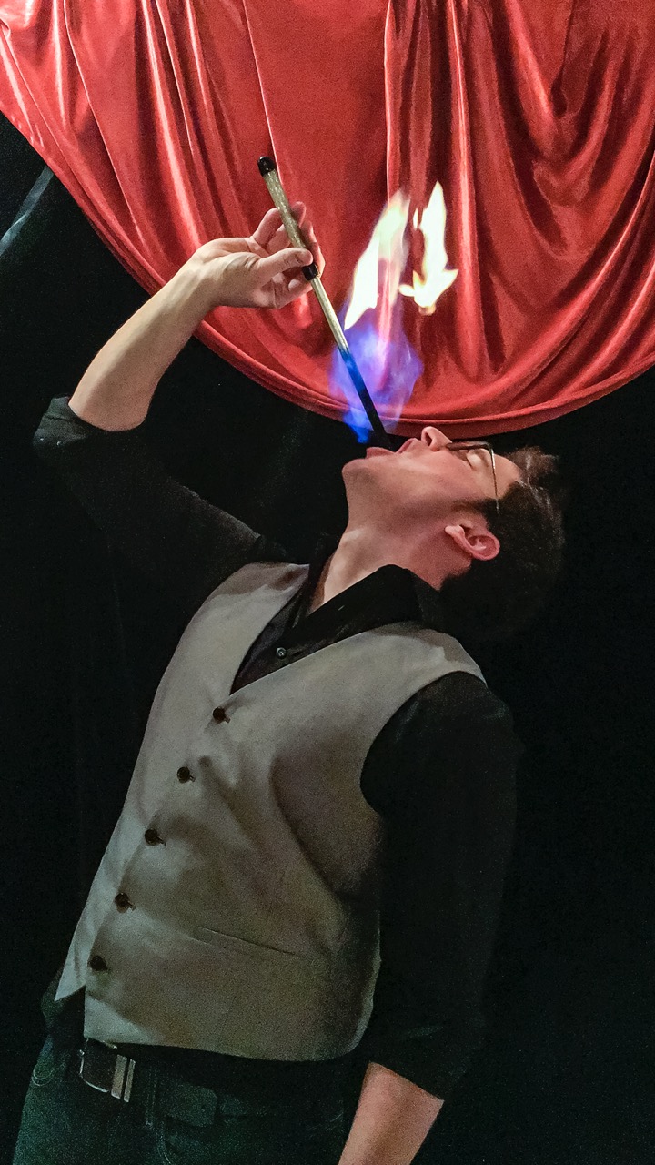 At birthday parties, he saws a child in half. “They’re always volunteers who don’t know how it’s done,” he said. But he really likes stage shows. “I like props. They’re very visually appealing. Lots of interesting things on the stage are more intriguing for the audience who wonder what they’ll be used for.” He has a trailer and can set up a stage to do an outside show. His wife Brianna is his assistant, and family vacations often get scheduled around gigs.