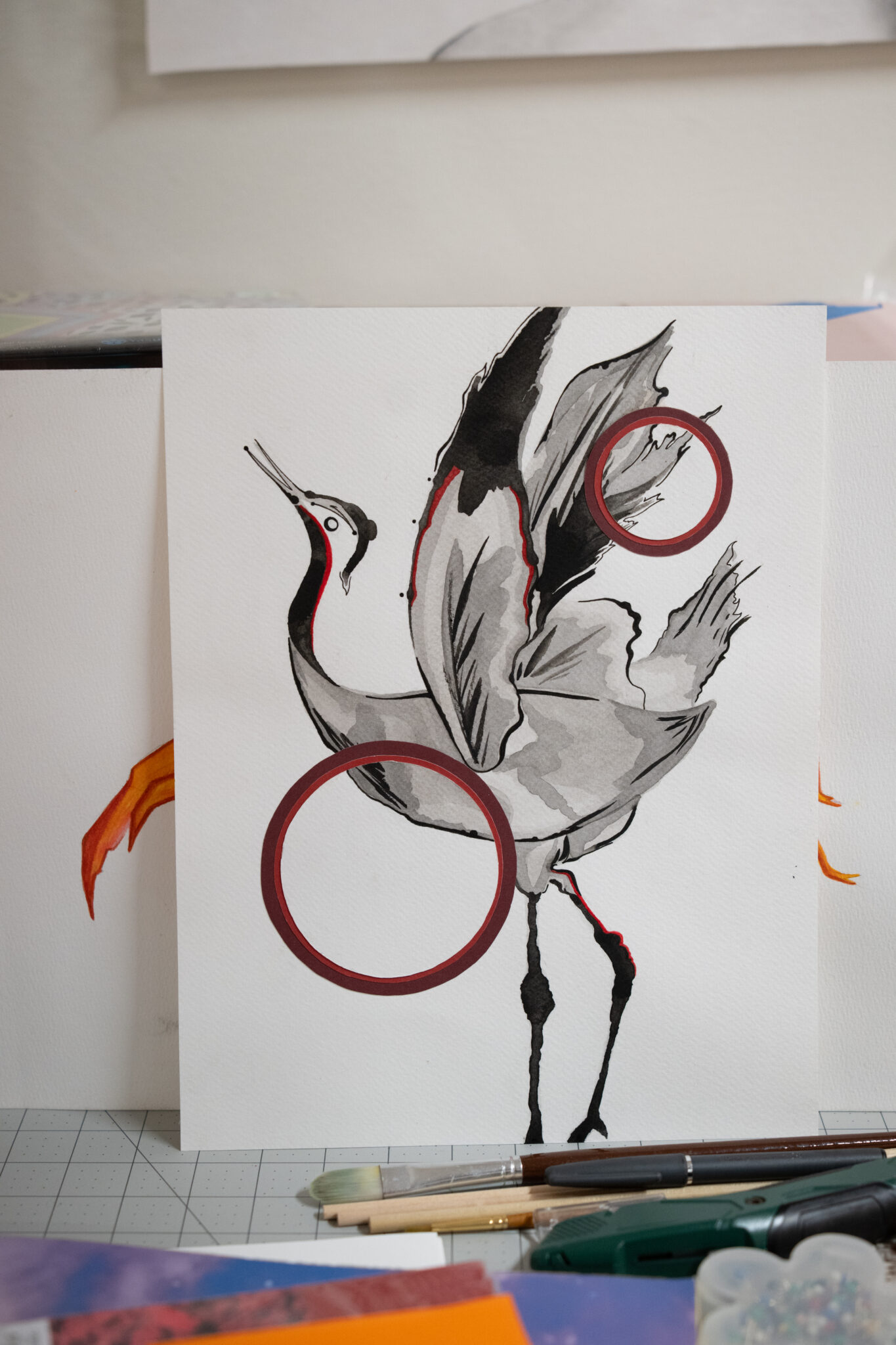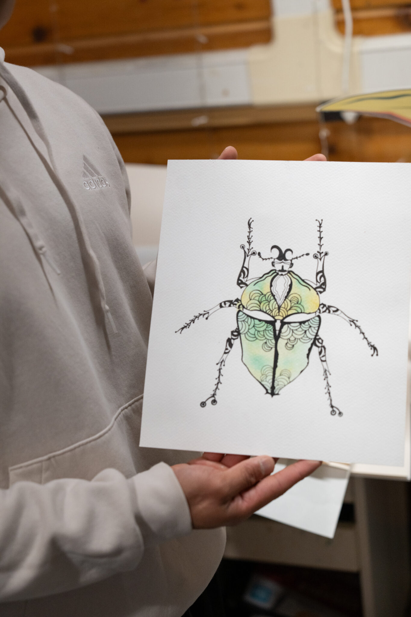 While he stands that he mainly does mixed media, college also introduced him to new mediums and techniques, which helped him to discover some of his favorites, including Prisma, pen and ink, lining, watercolors, paper sculpture, and printmaking, from which he has been recently introduced and now uses Northern’s printers for his art. However, one of Imus’ main purposes is to stand out as an artist, stepping out of the traditional and old style and, instead, looking for more innovative and progressive ways to make art. A way to do this is kinetic art: art that shows movement, usually pushed by a motor or internal engine.